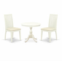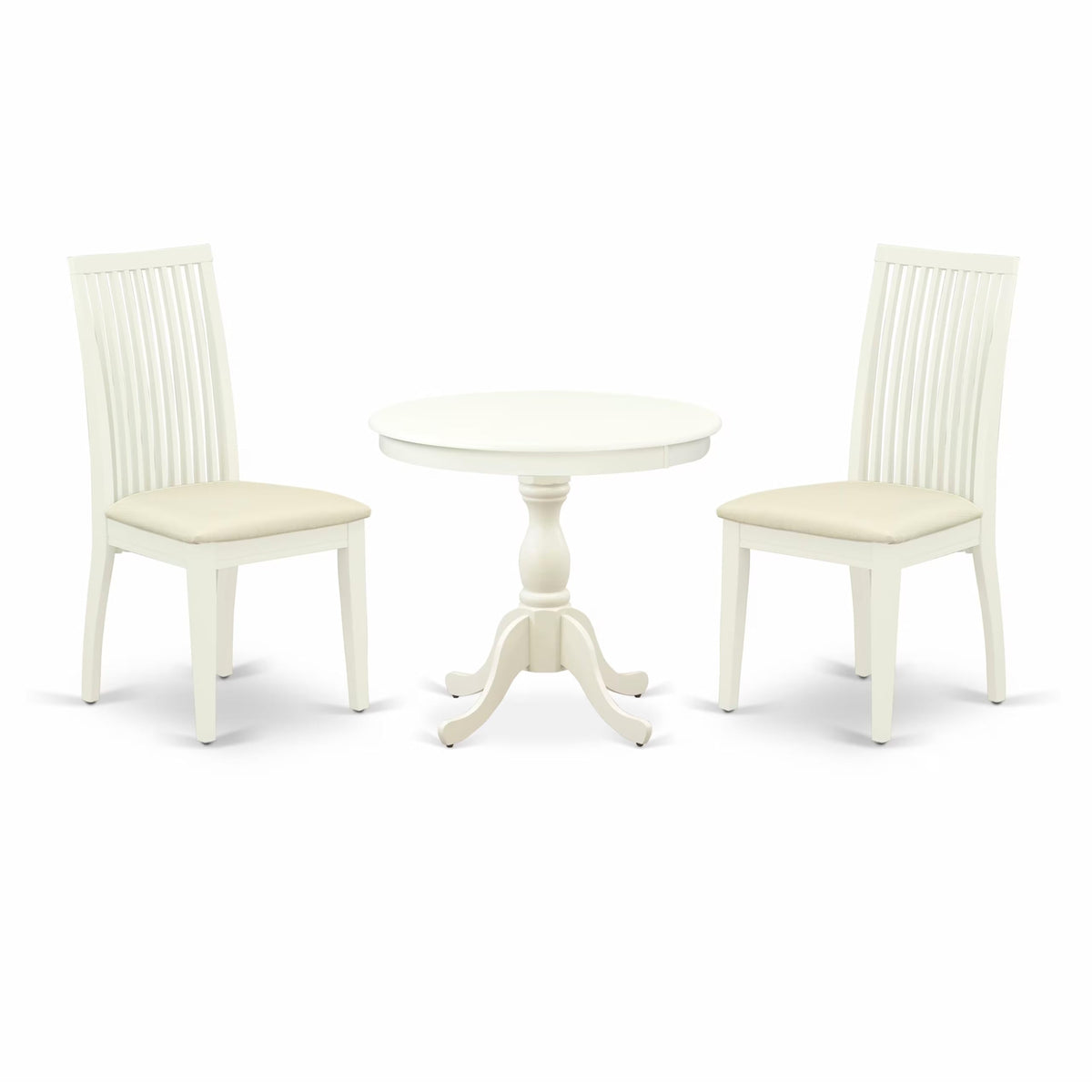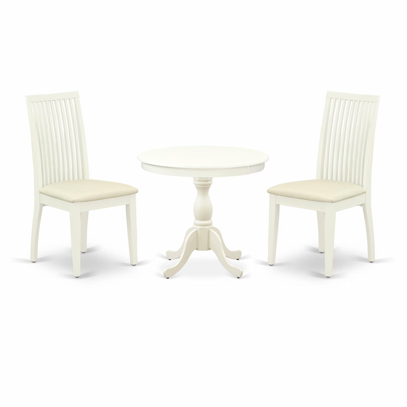 East West Furniture AMIP3-LWH-C 3 Piece Dining Set Contains a Round Dining Room Table with Pedestal and 2 Linen Fabric Upholstered Chairs, 36x36 Inch, Linen White