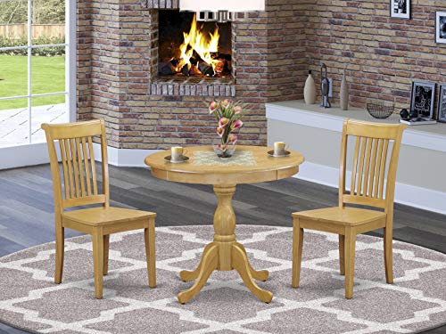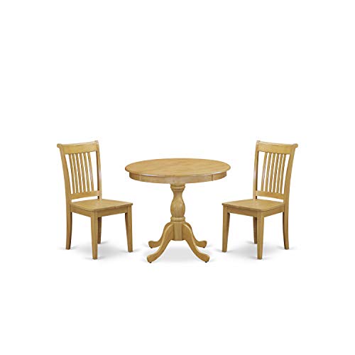 East West Furniture AMPO3-OAK-W 3 Piece Dining Room Furniture Set Contains a Round Dining Table with Pedestal and 2 Wood Seat Chairs, 36x36 Inch, Oak