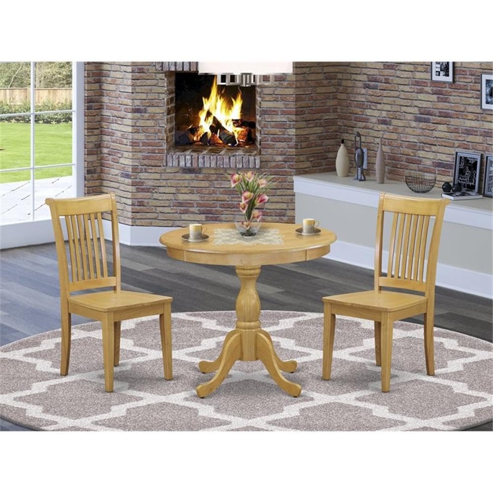 EAST WEST FURNITURE - AMPO3-OAK-W - 3-PC WOODEN DINING TABLE SETThe Elegant 3 Piece dining set comprises of a round pedestal dining table and two matching dining room chairs. Our dining room chairs exude sophistication and their innovative design can seamlessly complement any decor. The chair's contemporary Slatted Back design blends beautifully with the solid wood seat, creating a sophisticated appearance. This pedestal table is designed in a classical style, and the Oak color matches perfectly with the dining room chairs, enhancing their overall appeal. The spacious tabletop is made of high-quality Rubber Wood material, ensuring heightened toughness and long-lasting use. Designed with easy and fast assembly in mind, each set comes conveniently packed with easy-to-follow instructions and all necessary tools included. Our modern dining table set is easy to clean with a damp cloth and furniture cleanser due to its smooth brush finish. Enjoy an exquisite dining experience with East West Furniture!PRODUCT FEATURES: Seat Material: Wooden Color: Oak Chair Back Style: Slatted Back Dimension of Table: Length: 36; Width: 36; Height: 29.5. Chair Dimension: Length: 22; Width: 17; Height: 38.Include in Package: 2 Dining Chairs and A Dining Table.