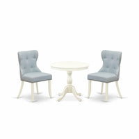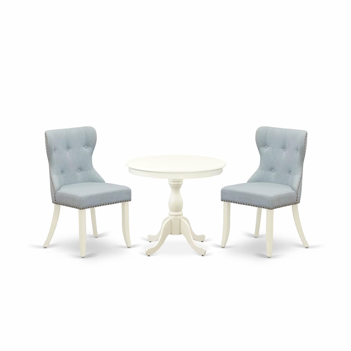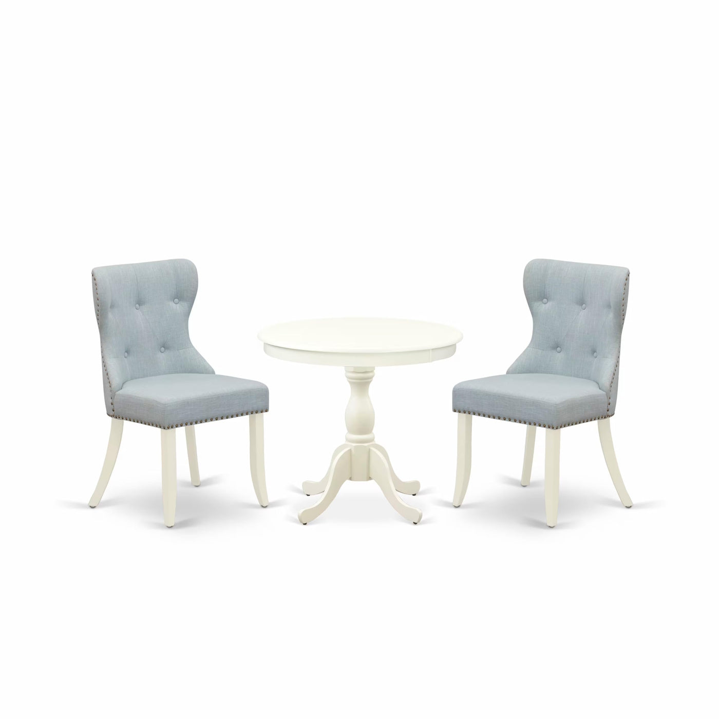 East West Furniture AMSI3-LWH-15 3 Piece Dining Table Set for Small Spaces Contains a Round Kitchen Table with Pedestal and 2 Baby Blue Linen Fabric Parsons Chairs, 36x36 Inch, Linen White
