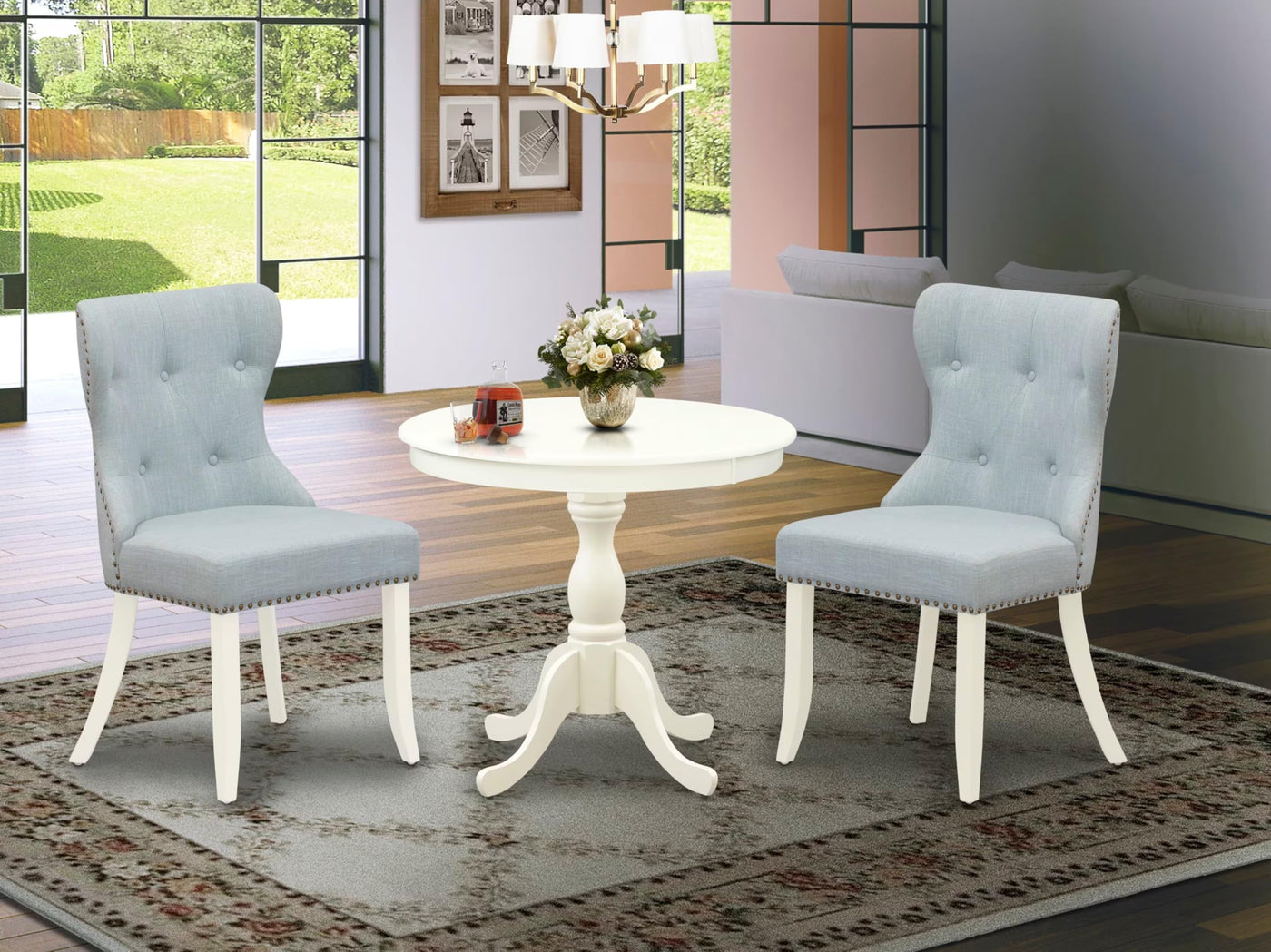 EAST WEST FURNITURE - AMSI3-LWH-15 - 3-PIECE DINING TABLE SETThe elegant 3-piece dining room table set consists of a wood dining table and 2 matching parson chairs that add a touch of sophistication to your room. The innovative design seamlessly complements any decor, while the contemporary button tufted chair back blends beautifully with the linen fabric seat, creating a sophisticated appearance. The chair's features include soft linen fabric upholstery, fine nailhead trim with spring support, comfortable padded cushion, and a solid natural wood frame that ensures both quality and design. The mid-century modern dining table is designed in a classical style, with a linen white color that matches perfectly with the linen fabric dining chairs, making it even more attractive. The spacious tabletop is made of excellent quality rubber wood material, ensuring heightened durability and long-lasting use. The set is designed with easy and fast assembly in mind, and each set comes conveniently packed with easy-to-follow instructions and all necessary tools included. This contemporary, budget-friendly, durable, and comfortable kitchen set furniture is an excellent choice if you are looking for a great dining experience with family and friends.PRODUCT FEATURES: Fabric Type: Linen Fabric Linen Fabric Color: Baby Blue Color: Linen White Chair Back Style: Button Tufted Dimension of Table: Length: 36; Width: 36; Height: 29.5. Chair Dimension: Length: 21.5; Width: 19.5; Height: 35.5.Include in Package: 2 Dining Chairs and A Wood Dining Table.
