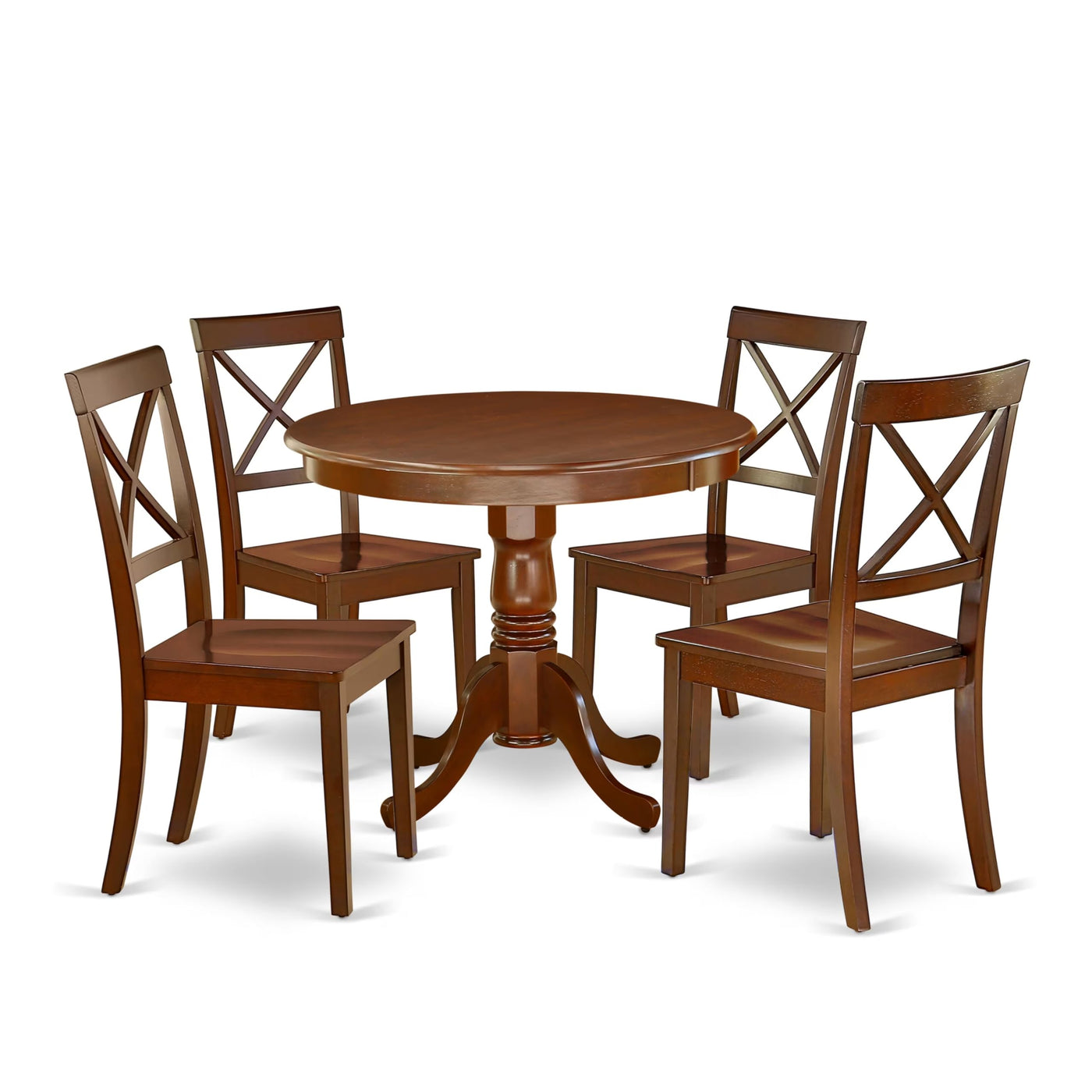 East West Furniture - Anbo5-Mah-W - Dining Setour Exceptional Dining Table Set Can Add A Touch Of Dining Beauty To Both Traditional And Trendy Home Decor. The Kitchen Dining Table Set Is Stunning, Featuring A Lovely 5-Piece Traditional Design With A Modern Twist In Its Curves And Details. The Wood Chairs And Wood Kitchen Table Are Made From Superior Quality Asian Wood (Rubber Wood), Providing Great Sturdiness And Stability To The Kitchen Dining Chairs And Modern Dining Table. The Dining Set Boasts A Modern Sturdy Solid Wood Structure, Comfortable Wooden Seats, X-Back Chairs, And A Reliable Round Kitchen Table, Offering A Leading-Edge Look To Your Kitchen And Wonderful Stability To The Fantastic Dining Room Table Set. The Modern Dining Table Set Is Easy To Carry, Clean, Assemble, And Relocate Due To Its Great Dimensions. The Classic Style Of The Pedestal Dining Table Complements Any Home Decor, And The Smooth Wooden Seat And X-Back Of The Kitchen Dining Chairs Ensure User Comfort.Product Features: Seat: Wooden Pedestal Dinner Table Color: Cappuccino Wood Chairs Color: Cappuccino Kitchen Dining Chairs Dimensions: Length: 21; Width: 18; Height: 38. Round Kitchen Table Dimensions: Length: 36; Width: 36; Height: 29.5.Includes: 4 Chairs For Dining Room And 1 Modern Dining Table