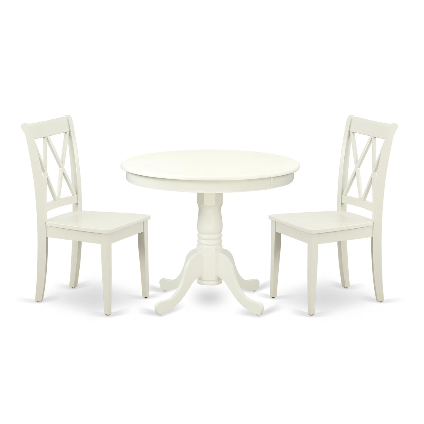 East West Furniture - Ancl3-Lwh-W- 3-Piece Dining Table Setthis Wood Kitchen Set Table Is Truly Exceptional And Can Make An Impressive Addition To Both Traditional And Stylishly Decorated Dining Spaces. This Dining Table Set Is Sure To Deliver A Great Dose Of Beauty To Your Dining Room, Thanks To Its Beautiful 3-Piece Traditional Design That Emphasizes Curves And Details, Adding A Modern Twist To A Classic Set. The Body Of These Unique 2 Dining Room Chairs And The Modern Dining Table Is Crafted From Premium Quality Asian Wood, Also Known As Rubber Wood, Ensuring Fantastic Sturdiness And Stability. The Modern Sturdy Hardwood Structure, Comfortable Wooden Seat, And Double X-Back, Reliable Pedestal Dining Table Offer A Cutting-Edge Look To Your Kitchen, Wonderful Stability To This Outstanding Kitchen Table Set, And Comfortable Support To Your Back. This Dining Table Set Is Super Easy To Carry, Clean, Assemble, And Adjust Its Placement, Thanks To Its Excellent Measurements. The Classic Style Of This Special Wood Kitchen Table Blends Perfectly With Any Home Decor, While The Smooth Wooden Seat And Double X-Back Of These Kitchen Chairs Provide Comfortable Seating For Users.Product Features: Seat: Wooden Mid Century Dining Table Color: Linen White Wooden Dining Chairs Color: Linen White Dining Room Chairs Dimensions: Length: 22; Width: 18; Height: 37. Round Dining Table Dimensions: Length: 36; Width: 36; Height: 29.5.Includes: 2 Kitchen Chairs And 1 Modern Dining Table