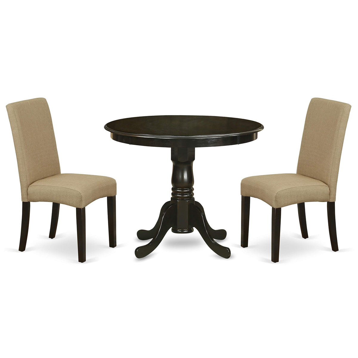 East West Furniture - Andr3-Cap-03 - 3-Piece Dining Table Setelevate The Ambiance Of Your Dining Area Or Kitchen With The 3-Pc Kitchen Set. The Dining Set Includes A Round Dining Table And 2 Dining Chairs. The Cappuccino Solid Wood Dining Table And Frame, Combined With The Brown Linen Fabric Seats And Backs On The Chairs, Exude Timeless Elegance And Enhance The Allure Of Your Dining Room. This Durable Set Is Expertly Constructed With Asian Wood, More Commonly Known As Rubberwood, And Is Meticulously Finished By Highly Skilled Carpenters, Resulting In A Smooth And Refined Look. Assembling The Fashionable Pedestal Table And Dining Chairs Is A Hassle-Free Process With The Included Instructions, And The Set Is Easy To Maintain With Any Furniture Cleaner, Ensuring A Fresh And Inviting Appearance To Your Dining Area.The Kitchen Set We Have Is Simple To Maintain And Can Be Cleaned With Any Standard Furniture Cleaner. Although It May Require Some Time, The Kitchen Dining Table Set Is Effortless To Clean And Will Always Leave A Pleasant And Tidy Look. Product Features: Fabric: Linen Fabric Fabric Color: Brown Wood Color: Cappuccino Dining Table Dimension: Length: 36; Width: 36; Height: 29.5. Dining Chairs Dimension: Length: 24.2; Width: 19.2; Height: 39.Package Include: 2 Padded Parson Chairs And A Pedestal Dining Table