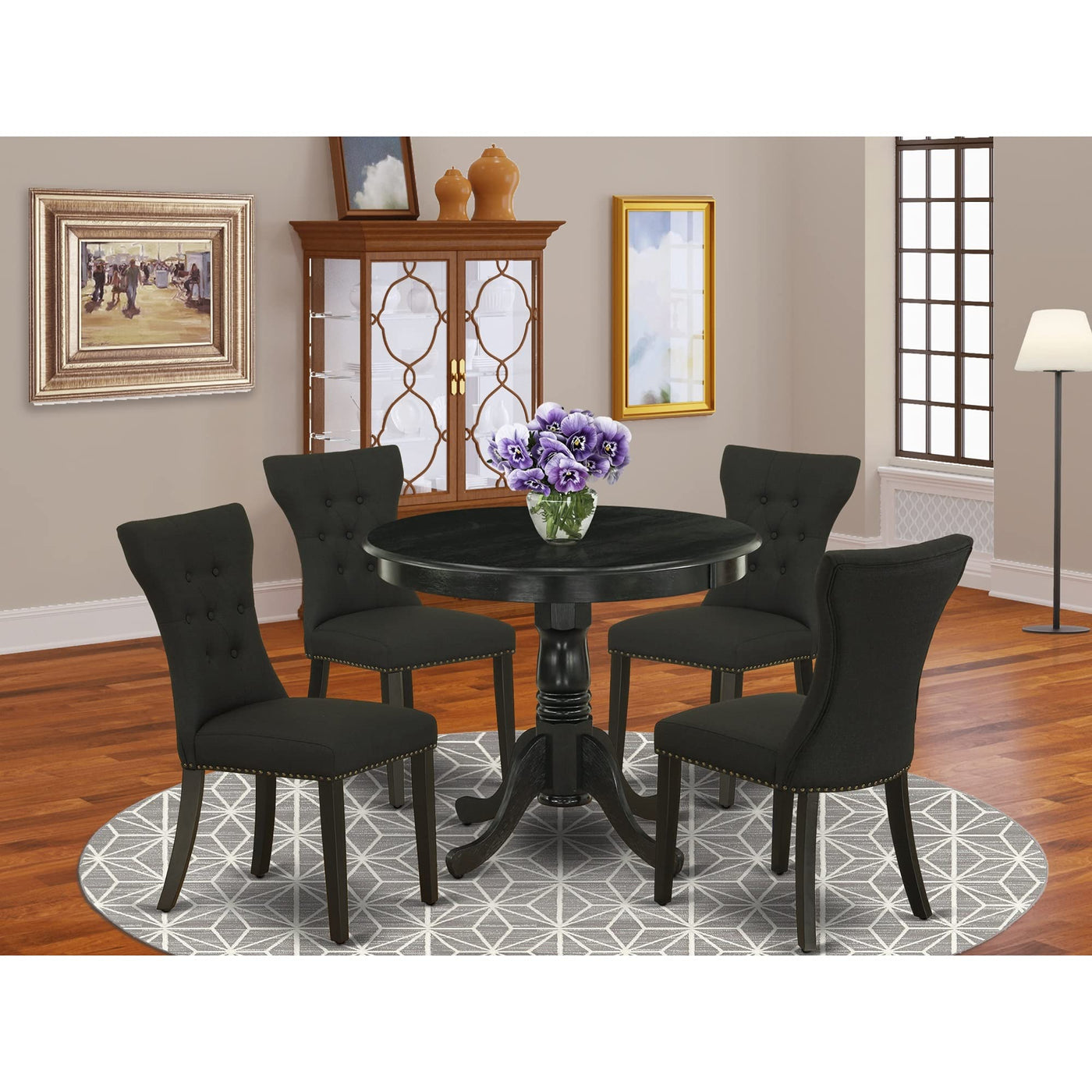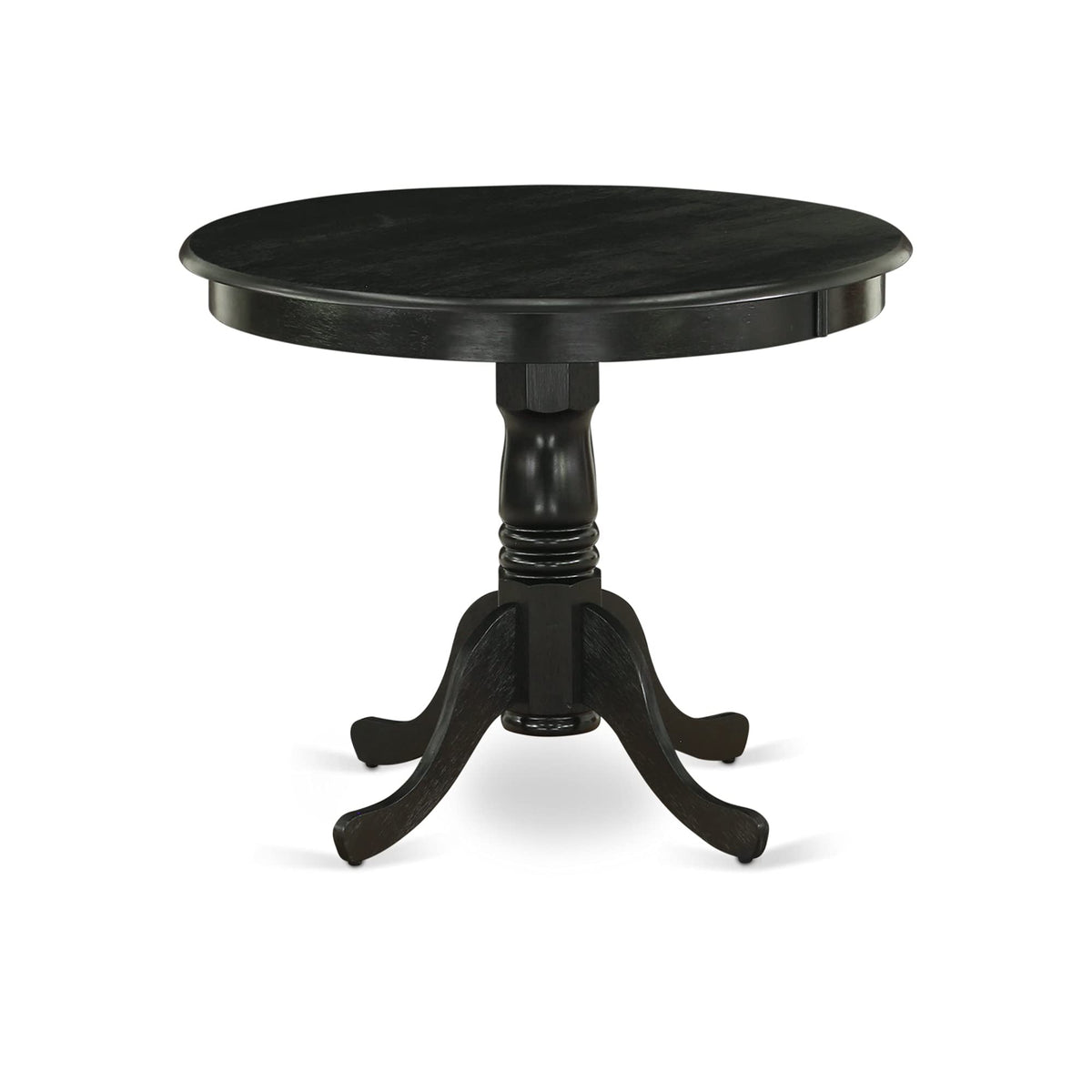 East West Furniture - Anga5-Abk-24- 5-Piece Dining Table Setelevate The Aesthetic Appeal Of Your Dining Or Kitchen Area With The East West Furniture 5-Piece Kitchen Set, Comprising A Luxurious Round Wooden Kitchen Table And 4 Comfortable Parsons Dining Room Chairs. The Wire Brushed Black Finish Of The Table Set Radiates An Elegant And Sophisticated Look, Adding A Touch Of Refinement To Your Interior. The Compact Design Of The Dining Table Renders It A Perfect Fit For Smaller Spaces, And The Soft Black Linen Fabric Cushioned Seat And Button-Tufted Backrest, Deliver A Plush Seating Experience. This Dining Table Set Is Meticulously Crafted From Durable Asian Wood Called Rubber Wood, Renowned For Its Resilience. This Kitchen Set Boasts An Ergonomic Design That Ensures Optimal Comfort. The Assembly Of This Kitchen Table Set Is A Breeze, With The Set Of Instructions, Tools, And Hardware Provided, And Cleaning This Dining Set Is A Simple Task With A Damp Cloth. With Ample Space For Your Loved Ones, This Dining Set Is A Perfect Blend Of Simplistic Beauty And Contemporary Flair, Elevating The Charm Of Your Living Space.Product Features: Frame Material: Asian Wood Frame Color: Wire Brushed Black Fabric Material: Linen Fabric Fabric Color: Black Chairs Sizes: Length: 23; Width: 18; Height: 36. Table Sizes: Length: 36; Width: 36; Height: 29.5.Included: A Kitchen Table And 4 Parson Dining Chairs