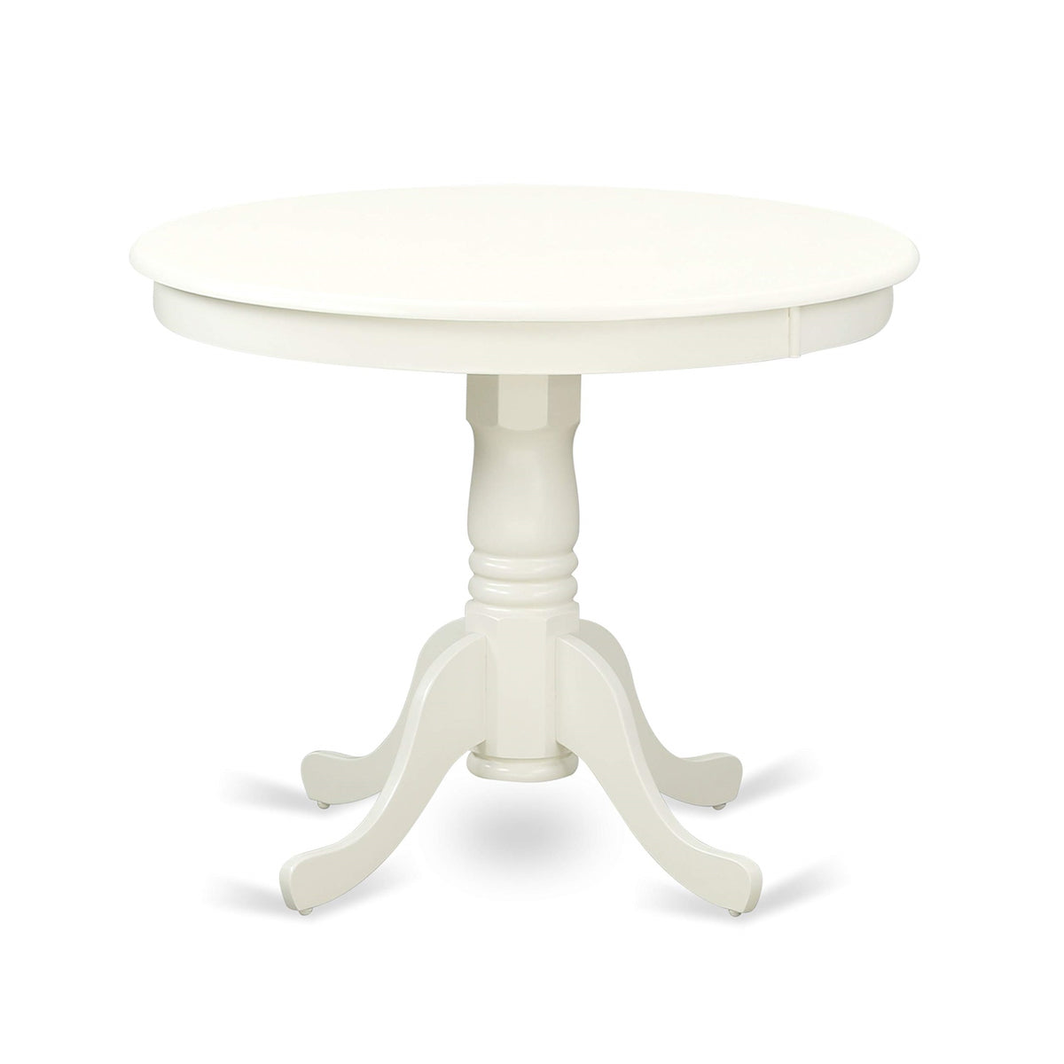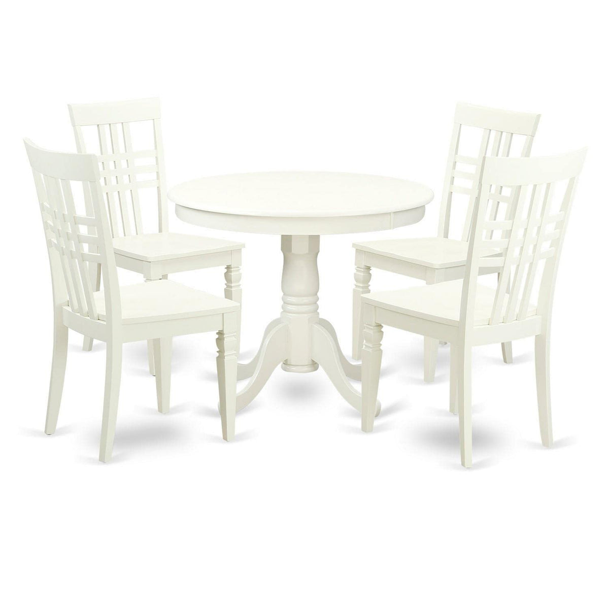 EAST WEST FURNITURE - ANLG5-LWH-W - 5-PIECE DINING TABLE SETOur dining table set consists of a wooden table and 4 kitchen chairs. This kitchen table set is a testament to fine craftsmanship and design, sure to impress in any dining setting. The gorgeous 5-piece traditional kitchen set seamlessly blends classic and modern elements, with intricate curves and details lending a contemporary twist to its timeless composition. The dining table features a Linen white round table top with pedestal legs. The wood kitchen chairs have Linen white wooden seats and a panel backrest that offer unparalleled support and comfort. Crafted from premium Asian wood (Rubber Wood), the table and chairs boast outstanding sturdiness and stability, built to withstand daily use. The solid wood construction of the table set offers unparalleled support and comfort that ensures a pleasant dining experience for guests. The dining set optimal size facilitates easy transport, cleaning, assembly, and rearrangement. The elegant design of the dining room table effortlessly complements any home decor, while the smooth wooden seats and panel backs of the chairs provide exceptional user comfort. Overall, this exquisite kitchen table set is a superb choice for those seeking a high-quality, visually stunning addition to their dining space.PRODUCT FEATURES: Frame Material: Asian Wood Chair Seat Material: Wooden Frame Color: Linen White Chair Back Style: Panel Back Dining Chairs Dimensions: Length: 23; Width: 18; Height: 39. Dining Table Dimensions: Length: 36; Width: 36; Height: 29.5.Includes: 4 Dining Room Chairs and 1 Wood Kitchen Table.