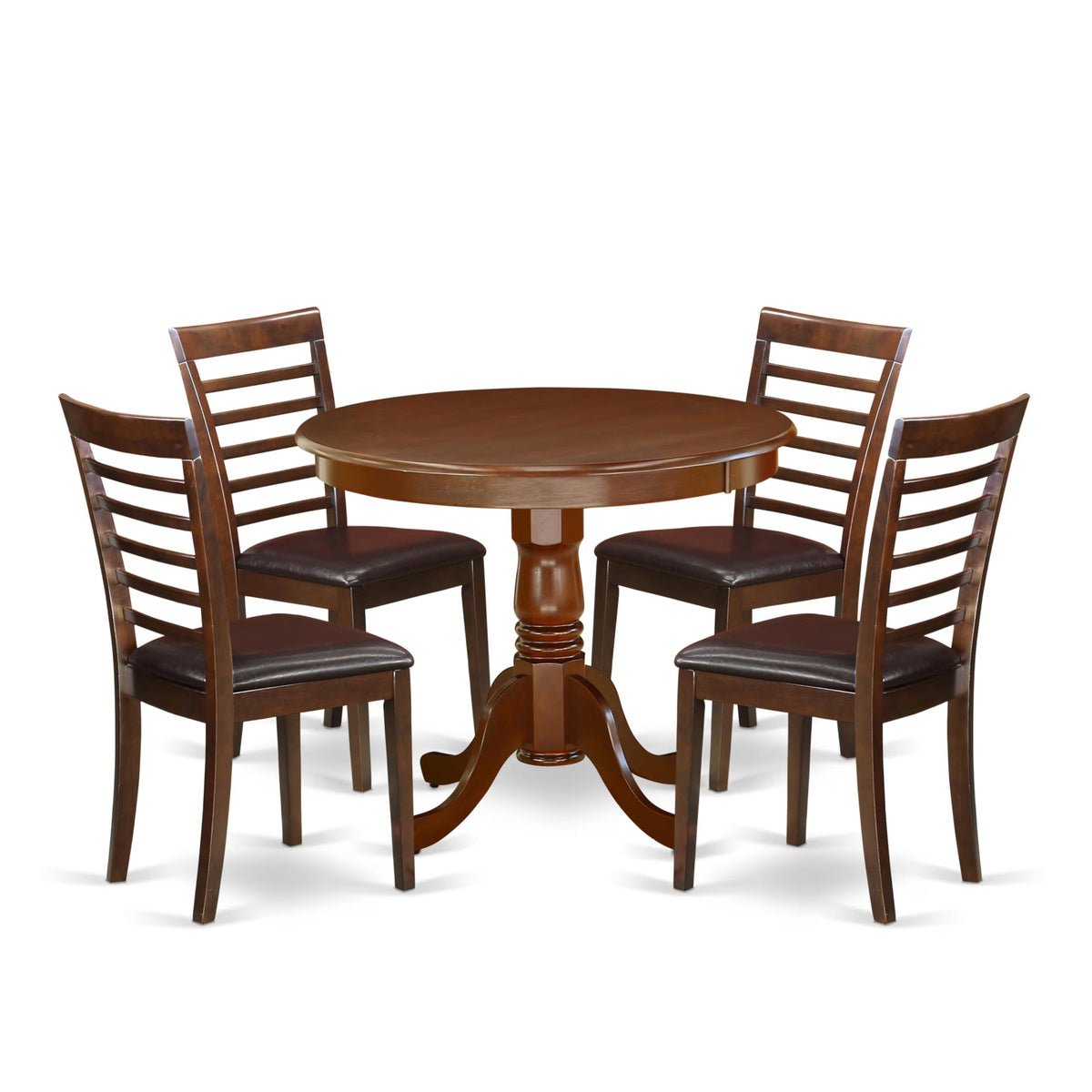 East West Furniture - Anml5-Mah-Lc - 5-Piece Kitchen Table Setto Enhance The Elegance Of Your Dining Area With A Classic Charm, Consider This Transitional Style Kitchen Table Set. This 5-Piece Traditional Kitchen Table Set Adds A Wonderful Dose Of Style To Your Dining Room, Highlighting Its Curves And Details With A Modern Twist. Made From High-Quality Asian Wood (Rubber Wood), The Dining Chairs And Wood Table Are Sturdy And Stable. The Chairs Have Ladder-Backs And Comfortable Faux Leather Seats, While The Breakfast Table Is Reliable And Durable. The Modern Sturdy Hardwood Structure Gives This Kitchen Table Set An Innovative Look, With Superb Stability And Comfortable Support To Your Back. With Its Excellent Measurements, This Dining Room Table Set Is Easy To Carry, Clean, Assemble, And Adjust Its Placement. The Classic Styles Of This Special Breakfast Table Match Perfectly With Any Home Decoration, And The Smooth Faux Leather Seats And Ladder-Back Chairs Keep Users Comfortable.Product Features: Seat: Faux Leather Wood Table Color: Mahogany Wooden Dining Room Chairs Color: Mahogany Dining Chairs Dimensions: Length: 22; Width: 17; Height: 38. Round Dining Table Dimensions: Length: 36; Width: 36; Height: 29.5.Includes: 4 Kitchen Chairs And 1 Dinner Table