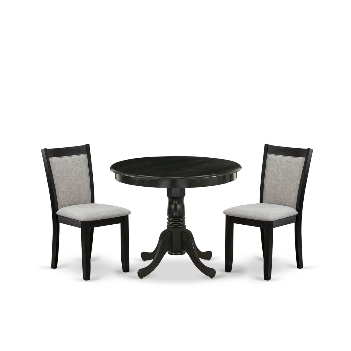 East West Furniture ANMZ3-AB6-06 3 Piece Kitchen Table & Chairs Set Contains a Round Dining Room Table with Pedestal and 2 Shitake Linen Fabric Upholstered Chairs, 36x36 Inch, Wirebrushed Black