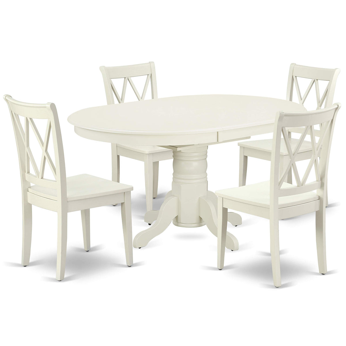 East West Furniture - Avcl5-Lwh-W- 5-Piece Dining Table Setthis Exceptional Round Wooden Table Can Add An Exceptional Touch To Both Traditional And Modern Decor. The Beautiful 5-Piece Traditional Dining Room Set Features A Mix Of Traditional Curves And Modern Details. The Body Of The Unique Wooden Dining Chairs And Butterfly Leaf Wood Dining Table Is Made Of High-Quality Asian Wood (Rubber Wood), Providing Excellent Durability And Stability. The Sturdy Solid Wood Structure, Comfortable Wooden Seat, And X-Back, Dependable Kitchen Table Offer A Modern Look To Your Kitchen, Great Stability To This Fantastic Modern Kitchen Table Set, And Comfortable Support To Your Back. Thanks To Its Excellent Dimensions, This Wooden Dining Room Set Is Easy To Carry, Clean, Assemble, And Move Around. The Classic Styles Of This Special Breakfast Table Fit Perfectly With Any Home Decor, And The Smooth Linen White Wooden Seat And X-Back Of These Dining Room Chairs Provide Users With A Comfortable Seating Experience.Product Features: Seat: Wooden Color: Linen White Kitchen Dining Chairs Dimensions: Length: 22; Width: 18; Height: 37. Dinner Table Dimensions: Length: 60/42; Width: 42; Height: 30.Includes: 4 Wooden Chairs And 1 Wood Dining Table.