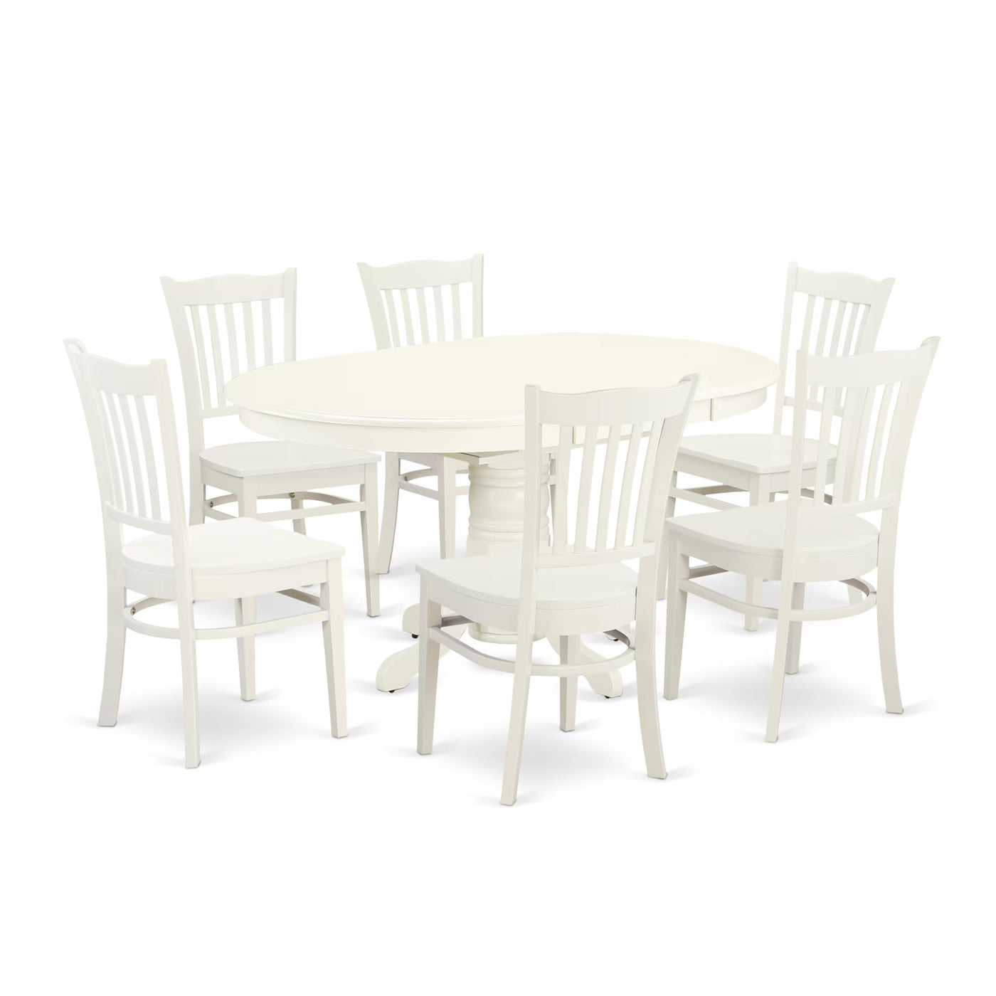 EAST WEST FURNITURE - AVGR7-LWH-W - WOODEN TABLE SETThe 7-piece Traditional dining set features beautiful curves and intricate details, which lend a modern twist to the otherwise traditional design. The modern and sturdy solid wood structure, along with the comfortable wooden seat and slatted back, provide a comfortable and cozy dining experience. The body of the unique wood dining chairs and wood dining butterfly leaf table is made from premium-quality Asian wood (Rubber Wood), ensuring optimal sturdiness and stability for the dining room chairs and dining room table. This contemporary dining table is an exceptional piece of furniture that can make a striking impression on any dining area, whether it be decorated in a typical or modern style. The kitchen set is designed to bring an excellent dose of charm and elegance to your dining room. The reliable round kitchen table also offers innovative and stable support to the dining set. With its excellent dimensions, this dining table set is easy to carry, clean, assemble, and adjust its position. The classic style of this special dining room table perfectly matches any home decor, and the smooth Linen White wooden seat and slatted back of these dining room chairs ensure maximum comfort for users.PRODUCT FEATURES: Seat: Wooden Round Kitchen Table Color: Linen White Kitchen Dining Chairs Color: Linen White Wood Dining Chairs Dimensions: Length: 21; Width: 18; Height: 37. Round Wooden Dining Table Dimensions: Length: 60/42; Width: 42; Height: 30.Includes: 6 Wood Chairs and a Round Dining Table