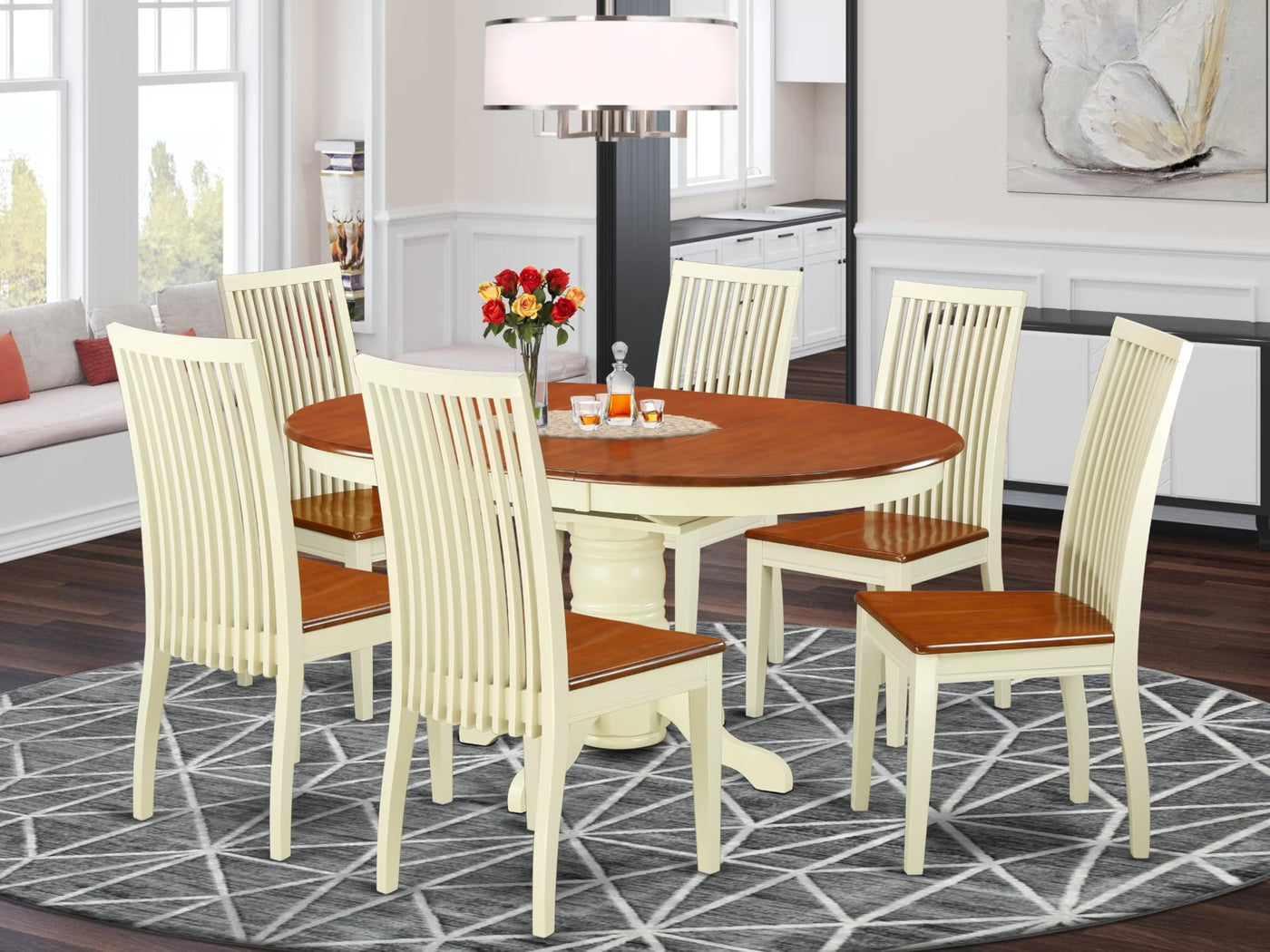 EAST WEST FURNITURE - AVIP7-BMK-W - WOODEN DINING ROOM SETThe 7-piece traditional dining table set is particularly noteworthy for its attractive curves and intricate details, which imbue it with a contemporary twist. The solid wood structure, comfortable wooden seat, and slatted back of the chairs, along with the reliable dining table, provide a sophisticated and comfortable dining experience. The set's excellent dimensions allow for easy transport, cleaning, assembly, and relocation. The classic design of the pedestal dining table complements any home decor, while the smooth cherry wooden seat and slatted back of the chairs offer users an exceptional level of comfort. This exceptional kitchen table boasts the ability to imbue a sense of dining elegance, suitable for both traditional and modern decor schemes. The chairs and butterfly leaf table are expertly crafted from superior quality Asian wood (Rubber Wood), resulting in exceptional durability and stability. In addition to its aesthetic appeal, this dining room table set is crafted with superior craftsmanship, emphasizing quality and longevity. As such, it is a practical and sophisticated addition to any household.PRODUCT FEATURES: Seat: Wooden Dining table color: Cherry and buttermilk Dining room chairs Color: Cherry and buttermilk Dinner table Dimensions: Length: 60/42; Width: 42; Height: 30. Dining room chairs Dimensions: Length: 21; Width: 18; Height: 39.Includes: 6 Kitchen Chairs and 1 Dining Room Table.