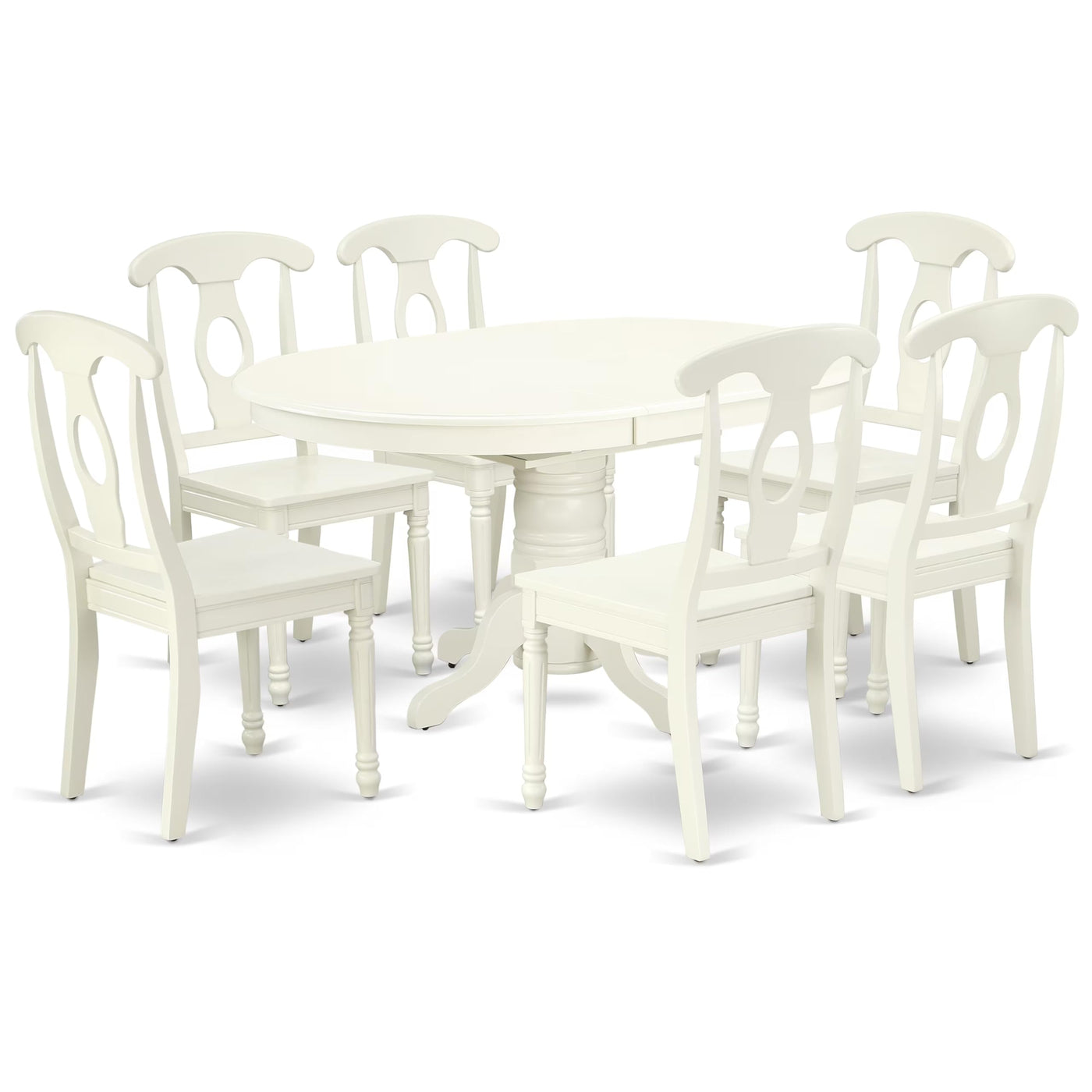 East West Furniture - Avke7-Lwh-W - Dining Table Setthis Exquisite Kitchen Table Set Is A Perfect Fusion Of Style And Practicality, Catering To Both Traditional And Contemporary Decors With Its Remarkable Impression Of Dining Style. Elevating The Aesthetic Appeal Of Your Dining Space This 7-Piece Wooden Dining Set Features A Dining Table And Six Wooden Chairs. The Oval Tabletop And Pedestal Legs Are Tastefully Finished In A Linen White Hue, While The Chairs Boast Comfortable Linen White Wooden Seats And Sturdy Wooden Legs. Crafted From Premium-Quality Asian Wood (Rubber Wood), The Unique Chairs And Table Are Engineered For Superior Durability And Stability. The Modern And Robust Hardwood Structure, Combined With The Comfortable Wooden Seat And Napoleon Back, Delivers A Cutting-Edge Look To Your Kitchen, Exceptional Stability To The Wooden Dining Set And Comfortable Support For Your Back. This Dining Set Is Easy To Transport, Clean, Assemble, And Customize To Your Preferences, Thanks To Its Manageable Dimensions. The Classic Design Of This Unique Wooden Table Complements Any Home Decor, And The Smooth Linen White Wooden Seat And Napoleon Back Of The Kitchen Chairs Ensure A Pleasant And Comfortable Dining Experience For Users.Product Features: Seat: Wooden Dinner Table Color: Linen White Dining Room Chairs Color: Linen White Wood Dining Table Dimensions: Length: 60/42; Width: 42; Height: 30 Dining Room Chairs Dimensions: Length: 21; Width: 18; Height: 38.Includes: 6 Dining Room Chairs And 1 Dining Room Table.