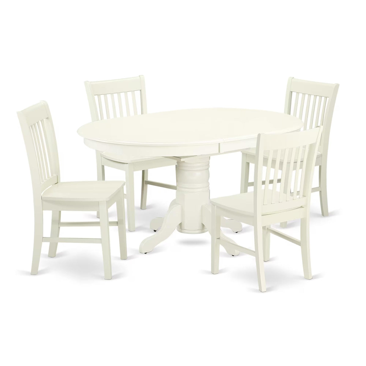 EAST WEST FURNITURE - AVNO5-LWH-W - 5-PC DINING TABLE AND CHAIRS SETThe 5-piece dining table set is designed to emphasize its curves and intricate details, imparting a modern twist to an otherwise classic ensemble. This exquisite round wooden dining table is capable of exuding an air of sophistication and elegance in traditional and contemporary dining settings. The modern and sturdy solid wood construction, coupled with comfortable wooden seats and slatted backrests, provide a cutting-edge look to your kitchen, superior stability to this exceptional modern dining table set, and comfortable support to your back. With its refined aesthetic, the kitchen dining table set adds a touch of beauty to your dining area. The unique wooden chairs and pedestal dining table are crafted from high-quality Asian wood (Rubber Wood), ensuring durability and stability. This dining table set is incredibly easy to transport, clean, assemble, and rearrange, owing to its optimal dimensions. The classic design of this distinctive modern dining table effortlessly blends with any home decor, while the smooth linen white wooden seats and slatted backrests of the kitchen dining chairs offer maximum comfort to users.PRODUCT FEATURES: Frame Material: Asian wood Chair Seat: Wooden Mid-century dining table color: Linen White Dining room chairs Color: Linen White Dining room table Dimensions: Length: 60/42; Width: 42; Height: 30. Kitchen dining chairs Dimensions: Length: 19; Width: 18; Height: 35.Includes: 4 Dining Room Chairs and 1 Wood Kitchen Table.