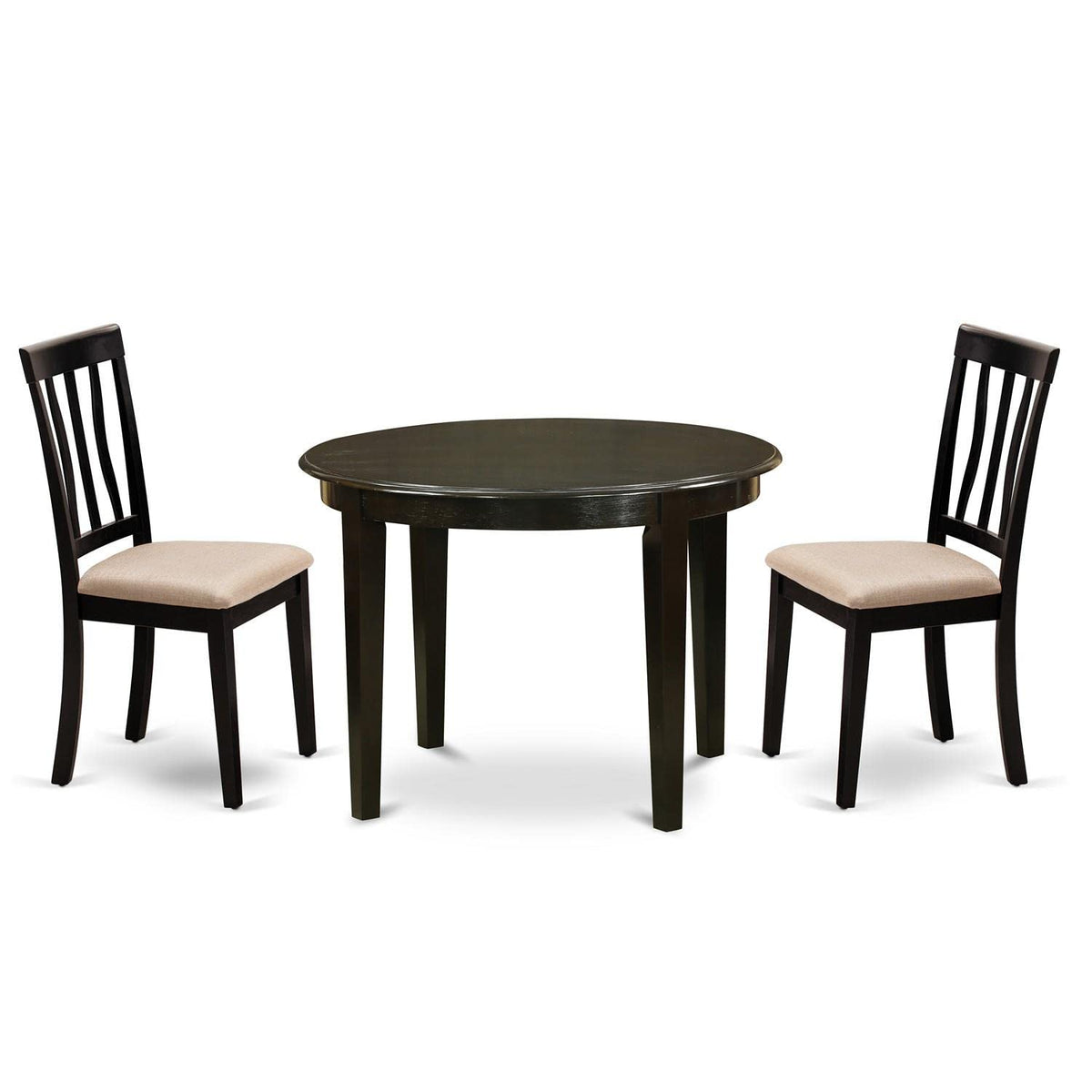 EAST WEST FURNITURE - BOAN3-CAP-C - 3-PC SMALL DINING TABLE SETIntroducing a fantastic kitchen set that will enhance the grace of your pretty dining area. This dining set includes 2 fantastic wood dining chairs and an impressive wood table, perfect for enjoying breakfast, lunch, or dinner with family and friends. The trendy design round dining table set boasts comfortable wooden chairs with Linen Fabric seat and wooden slat back, providing great support to your back and an awesome sitting experience. The round table top 4-legs design of this modern dining table adds to the beauty of this dining room table set. Expertly crafted by a highly trained carpenter, these wooden dining chairs and wood table offer a high-end check and high-quality finish. Manufactured with top-quality Asian wood, also called Rubber Wood, this modern dining table set provides fantastic durability and stability. Assembling and cleaning this small dining table set is easy, saving you time and effort. The assembly of these wooden chairs and wood table is painless and can be done at home. Almost all good cleaners work nicely on this modern dining table set, ensuring a refreshing appearance always.PRODUCT FEATURES: Chair Seat: Linen Fabric Frame Color: Cappuccino Table Legs: 4 Legs Table Top: Round Dimensions of Beautiful Wood Table: Length: 42; Width: 42; Height: 30. Measurement of Fabulous Wooden Chairs: Length: 20; Width: 18; Height: 38.5.Package Include: A Dining Room Table and 2 Dining Room Chairs