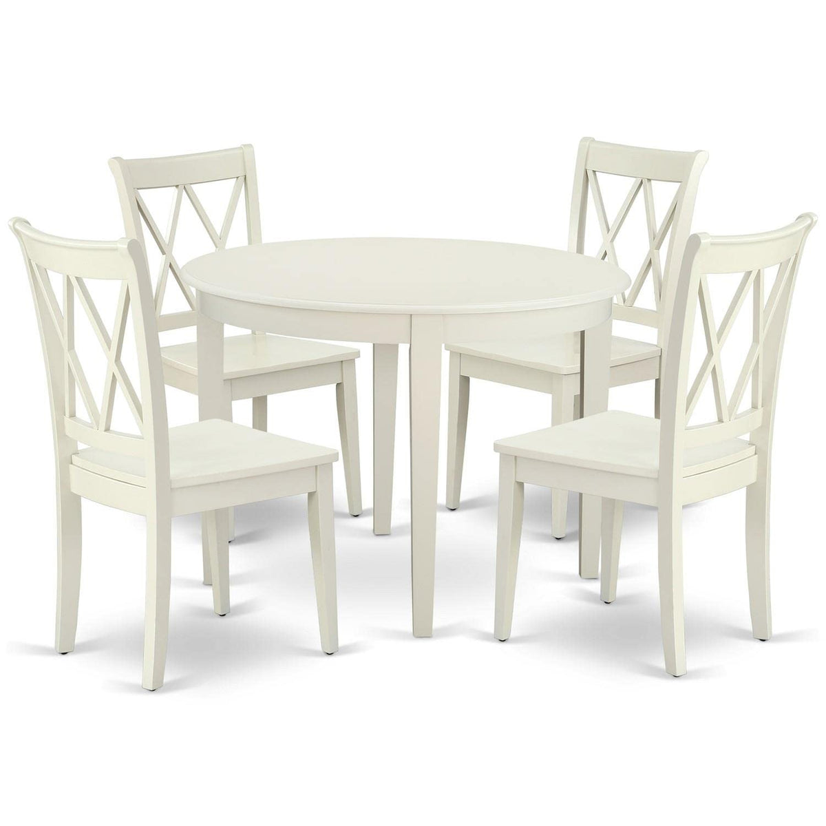 East West Furniture - Bocl5-Lwh-W - 5-Piece Dining Table Setthis Modern Dining Room Table Is A Fantastic Addition To Any Dining Space, Whether Your Decor Style Is Traditional Or Trendy. It Comes As A 5-Piece Kitchen Set That Includes 4 Beautiful Dining Chairs And A Stunning Breakfast Table With Intricate Curves And Details. While The Set Has A Traditional Feel, It Also Has A Touch Of Modernity That Adds To Its Overall Appeal. The Chairs And Table Are Made From Linen White Color Top-Quality Asian Wood, Specifically Rubberwood, Which Provides Excellent Sturdiness And Stability. The Solid Wood Construction Of The Dinner Table And Dining Chairs, As Well As The Comfortable Wooden Seats And Double X-Back Design, Ensure That This Dining Set Is Both Stylish And Comfortable. The Wooden Kitchen Table Offers Outstanding Stability To The Set, While The Dimensions Make It Easy To Move, Clean, Assemble, And Rearrange. The Classic Design Of The Table Also Makes It A Versatile Option That Can Complement Any Home Decor. Overall, This Wooden Set Is An Exceptional Choice That Will Provide A Cozy And Comfortable Dining Experience.Product Features: Frame Material: Asian Hardwood Seat: Wooden Wood Kitchen Table Color: Linen White Dining Chairs Dimensions: Length: 42; Width: 42; Height: 30. Wood Table Dimensions: Length: 22; Width: 18; Height: 37.Includes: 4 Kitchen Chairs And 1 Round Kitchen Table.