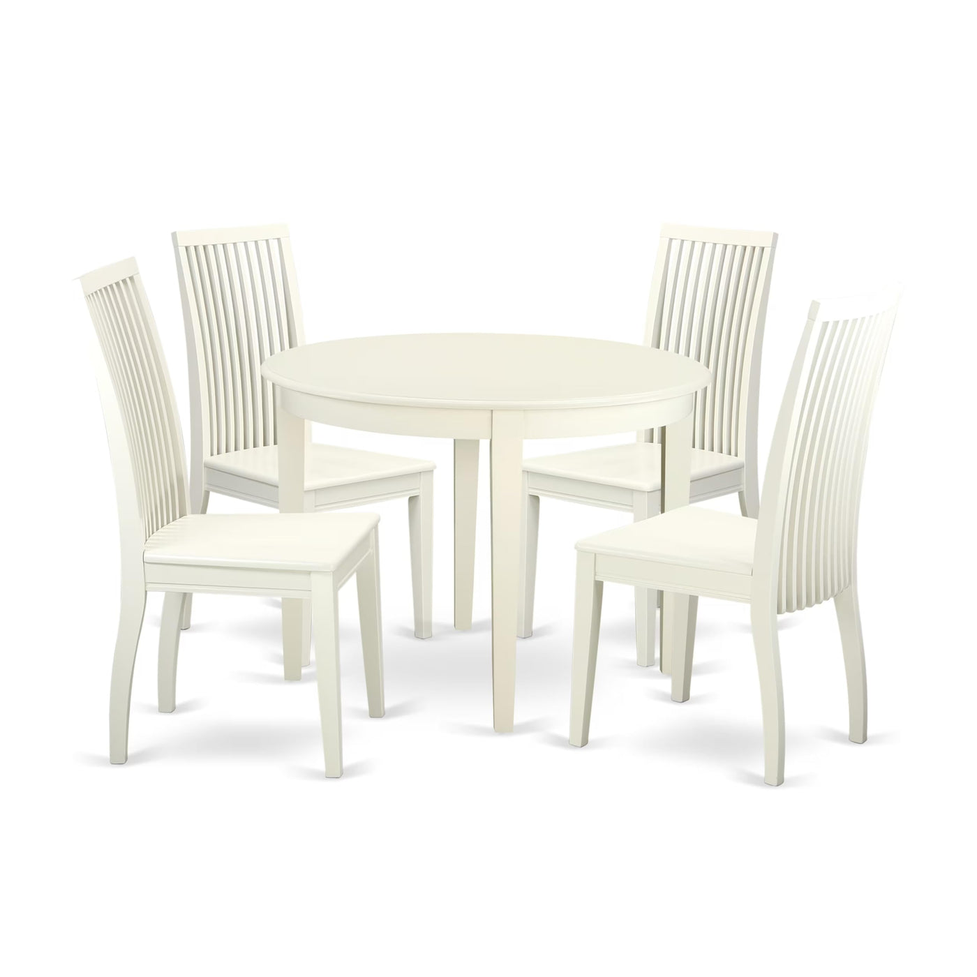EAST WEST FURNITURE - BOIP5-LWH-W - 5-PIECE DINING TABLE SETThis lovely kitchen dining table set is sure to catch your eye and enhance the beauty of your dining room. It includes a wonderful dinner table and 4 comfortable kitchen chairs that are perfect for enjoying breakfast, lunch, or dinner with your loved ones. The Wooden seat and Wooden Slat back of the modern chairs provide excellent support and a fantastic sitting experience. This wooden dining room set offers kitchen chairs with seats adorned in a classy Linen White finish, complemented by matching legs and a Linen White finish wooden dinner table. The round tabletop and 4 legs structure of this wooden table further improve the magnificence of this wooden dining table set. Crafted by highly trained carpenters, these dining chairs and table offer a high-end look and high-quality finish. Made with top-quality Asian real wood, also known as Rubber Wood, this small kitchen table set is incredibly durable and stable. Assembly and cleaning of this dining room set are both easy and hassle-free. You can easily assemble the wood kitchen chairs and table at home, and cleaning is a breeze with any furniture cleaner. This modern kitchen set will always provide a fresh look and will be a great addition to your dining room.PRODUCT FEATURES: Frame Material: Asian Wood Chair Seat: Wooden Frame Color: Linen White Table Legs: 4 Legs Table Top: Round Dimension of Round Table: Length: 42; Width: 42; Height: 30. Dimension of Dining Chairs: Length: 21; Width: 18; Height: 39.Package Include: A Dinner Table and 4 Modern Dining Chairs.
