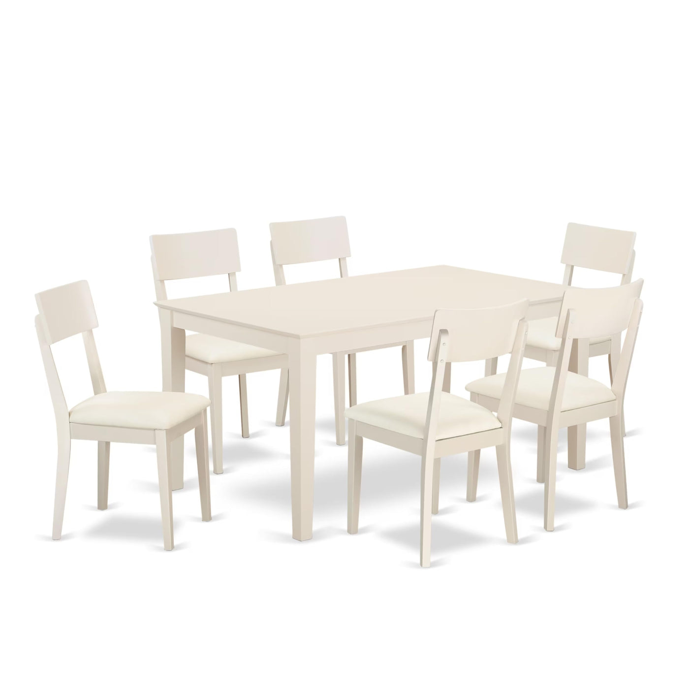 EAST WEST FURNITURE - CAAD7-LWH-LC - 7-PIECE DINING TABLE SETRevamp your dining area with this exquisite small dining table set, complete with a stunning dining table and 6 elegant wooden dining chairs. Designed to enhance the magnificence of your dining area, this kitchen table set boasts exceptional craftsmanship and quality finishes. The Faux Leather seats and Wooden slat backs of the dining chairs offer superior comfort and support, ensuring a pleasurable dining experience. The Linen White rectangular tabletop and 4-legged structure of the small rectangular table add to the set's sophistication and elegance, making it a beautiful addition to any home. Crafted by skilled carpenters, this mid-century dining table set is constructed with premium Asian solid wood, also known as Rubber Wood, providing excellent durability and stability. The assembly of this dining table set is effortless and straightforward, and its maintenance is a breeze. You can use almost any fine furniture cleanser to clean this kitchen nook table set, and it will maintain its beautiful appearance. In conclusion, this small dining table set is an ideal choice for anyone seeking to elevate their dining area's functionality and aesthetic appeal. Its timeless elegance and exceptional quality make it an excellent investment for any home.PRODUCT FEATURES: Chair Seat: Wooden Frame Color: Linen White Table Legs: 4 Legs Table Top: Rectangular Dimension of Wood Table: Length: 60; Width: 36; Height: 30. Dimension of Kitchen Dining Chairs: Length: 21; Width: 17; Height: 36.Package Include: A Modern Dining Table and 4 Kitchen Dining Chairs
