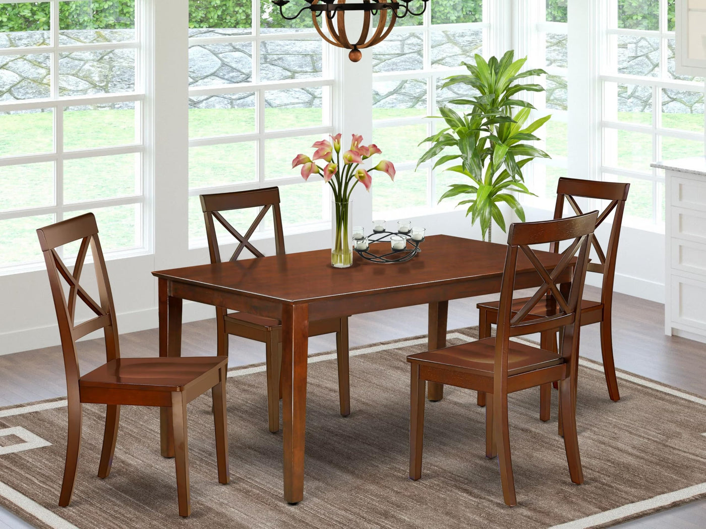 East West Furniture - Cabo5-Mah-W - 5-Piece Dining Table Setthis Exquisite Dining Room Is Graced By A Remarkable Kitchen Table Set That Features A Stunning Dining Table And 4 Elegant Wooden Dining Chairs. With Its Impeccable Design, This Dining Set Offers An Opportunity To Relish Meals With Family And Friends In Style. The Wooden X-Back And Wooden Seat Of The Chairs Provide Optimal Comfort And Back Support, Ensuring A Pleasant Seating Experience. The Mahogany Rectangular Tabletop And 4 Legs Structure Of The Dining Table Add To Its Magnificence, Enhancing The Overall Aesthetic Appeal Of The Dining Set. Skilled Carpenters Meticulously Crafted This Rectangular Dining Table Set, Ensuring Top-Notch Quality Finish And An Upscale Look. The Table And Chairs Are Constructed From Top-Grade Asian Solid Wood, Also Referred To As Rubber Wood, Which Offers Unparalleled Sturdiness And Stability. Assembly Of The Kitchen Dining Chairs And Small Rectangular Dining Table Is Effortless And Can Be Completed Expeditiously, Optimizing Time Efficiency. This Modern Dining Table Set Is Effortless To Maintain, And Can Be Cleaned With Any High-Quality Furniture Cleaner, Ensuring A Consistently Fresh Appearance.Product Features: Chair Seat: Wooden Frame Color: Mahogany Table Legs: 4 Legs Table Top: Rectangular The Dimension Of Dinner Table: Length: 60; Width: 36; Height: 30. Dimensions Of Dining Chairs: Length: 21; Width: 18; Height: 38.Package Include: A Wood Table And 4 Wooden Chairs