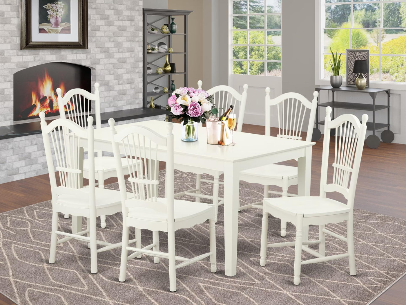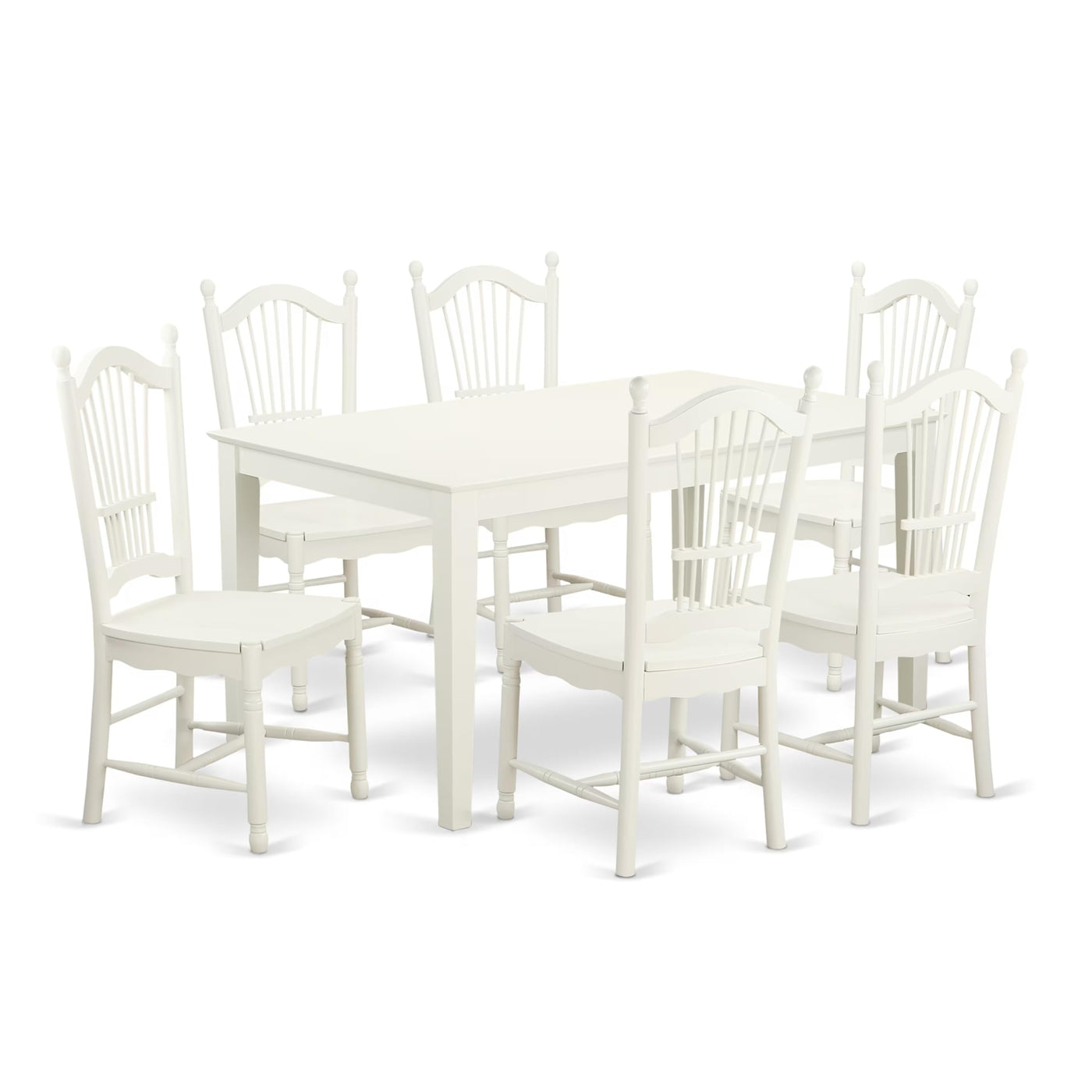 EAST WEST FURNITURE - CADO7-LWH-W - 7-PIECE DINING TABLE SETThis pretty dining room is enhanced by an attractive kitchen table set that includes 6 spectacular modern dining chairs and a stylish dining room table. The fashionable design of this kitchen dining table set is perfect for enjoying breakfast, lunch, or dinner with your family and friends. The dining chairs are comfortable due to their Wooden seat and Wooden Panel back, providing great support for your back and an amazing sitting experience. The rectangular table top with a four-leg structure of this small Rectangular dining table enhances the attractiveness of this kitchen nook table set. This dining set is built by the hands of a highly skilled carpenter, ensuring a luxurious check and high-quality finish. It is made from good quality Asian real wood, also known as Rubber Wood, which offers fantastic sturdiness and stability. The dining set is very easy to assemble and clean, and you can easily assemble the wooden chairs and the dining room table yourself at home. Moreover, it is easy to clean with any furniture cleanser, ensuring that it will always provide a fresh check. Overall, this attractive wood dining table set is a must-have for anyone looking to increase the elegance of their pretty dining room.PRODUCT FEATURES: Chair Seat: Wooden Frame Color: Linen White Table Legs: 4 Legs Table Top: Rectangular Dimension of Dinner Table: Length: 60; Width: 36; Height: 30. Measurements of Wooden Chairs: Length: 21; Width: 18; Height: 39.Package Include: A Dining Table and 6 Kitchen Chairs