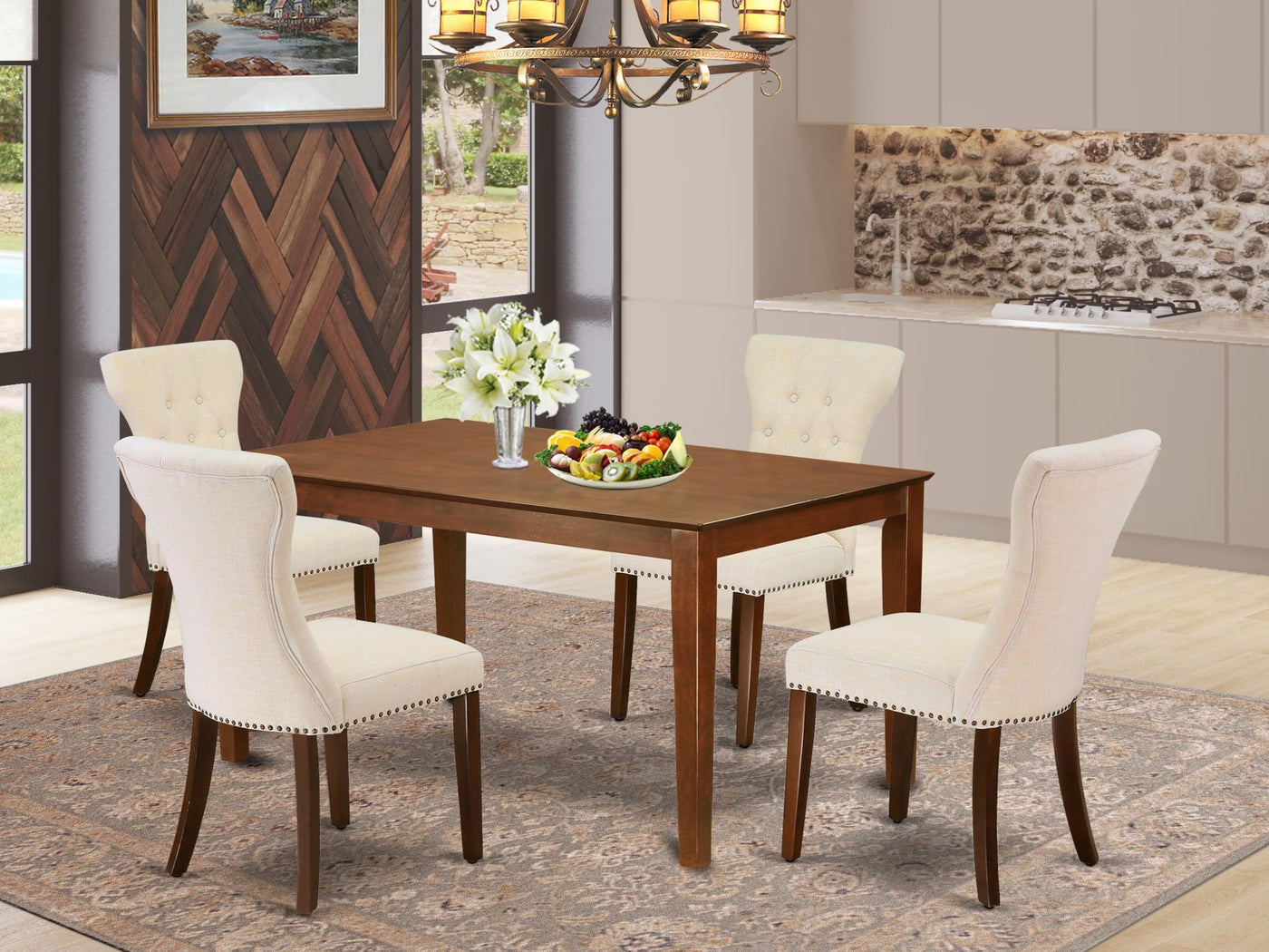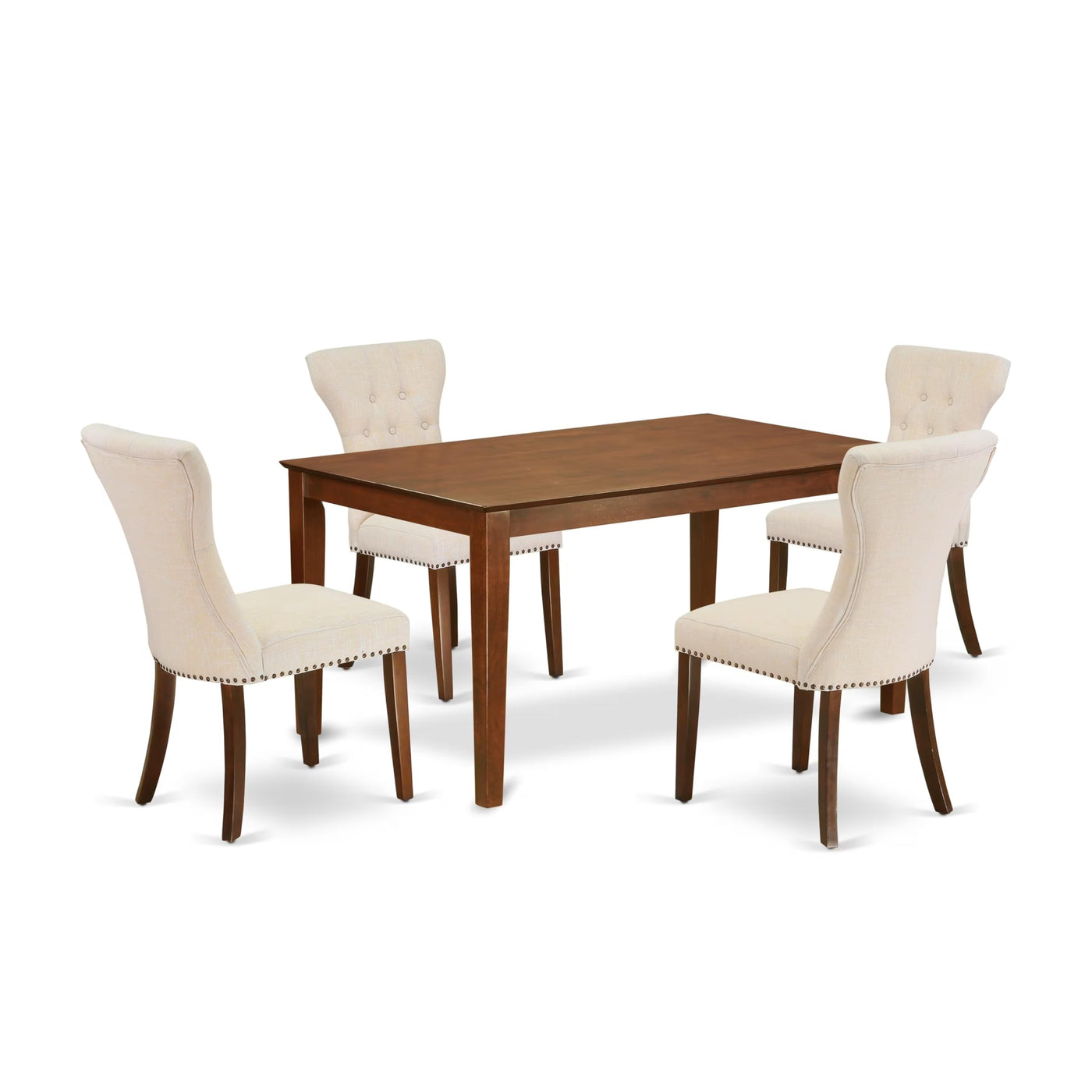 East West Furniture - Caga5-Mah-32 - 5-Pc Kitchen Dining Set:Introducing The East West Furniture 5-Piece Dining Table And Chairs Set, Featuring A Kitchen Table And 4 Comfortable Upholstered Chairs That Will Enhance The Beauty Of Your Dining Area. The Mahogany Finish Of The Single Rectangular Breakfast Table And 4 Dining Chairs Adds Elegance And Attractiveness To Your Space. Crafted From Durable Asian Wood, Also Known As Rubber Wood, This Dining Room Set Is Rugged Enough To Withstand Years Of Use. The Ergonomic Design Of The Set Ensures Maximum Comfort For You. The Soft Linen Fabric Cushion Seat Of The Fabric Modern Chairs Features A Solid Rubberwood Leg And A Stylish Soft Linen Fabric Backrest With An Asian Wood Frame, Soft Cushion, And Stylish Button-Tufted Design, Making You Feel Even More Comfortable. This Kitchen Table Is Flexible And Comfortable, With A Compact Design That'S Perfect For Small Spaces. The Padded Parson Chairs And Breakfast Table Provide Ample Space For Your Family Or Friends. Our Modern Set Adds Modern Beauty To Your Home. The Package Includes Easy-To-Follow Instructions, Tools, And Hardware, Allowing You To Quickly Assemble The Parsons Dining Chairs And Dining Table With A Basic Tool, Without Requiring Any Additional Tools. You Can Easily Clean The Set With A Damp Cloth To Remove Any Dust.Product Features: Linen Fabric Kitchen Parson Chairs Seat Color: Light Beige Kitchen Chairs Legs Color: Mahogany Modern Dining Table Color: Mahogany Dining Room Table Sizes: Length: 60; Width: 36; Height: 30. Padded Parson Chair Sizes: Length: 23; Width: 18; Height: 36.Package Included: An Attractive Rectangular Dining Table And 4 Fantastic Kitchen Chairs.