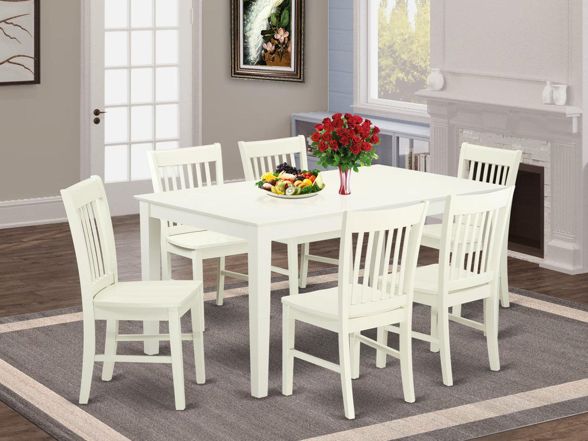 EAST WEST FURNITURE - CANO7-LWH-W - 7-PIECE DINING TABLE SETEnhance the beauty of your kitchen area with this impressive dining room set. Featuring an elegant breakfast table, and 6 fabulous wood dining chairs, this dining room set is perfect for enjoying breakfast, lunch, or dinner with your loved ones. Complete your dining room with our stunning set featuring dining room chairs with wooden seats and stylish Linen White finish legs, a Linen White finish dinner table, and a hardwood bench supported by 4 legs. The beautiful Linen White color scheme of this dining table set is sure to elevate the appeal of your kitchen. The wooden seats and slat backs of the chairs provide excellent support and comfort, making for a marvelous sitting experience. Crafted by skilled carpenters, this kitchen table set boasts a luxurious look and a high-end finish. Made from premium Asian wood, also known as Rubber Wood, this set is sturdy and durable. The simple 4-legged design of the hardwood kitchen bench and rectangular table top add to the set's attractiveness, while the easy assembly and cleaning make it a convenient addition to your home. Whether you use a fine cleaner or any furniture cleaner, this set always maintains its refreshing appearance.PRODUCT FEATURES: Frame Material: Asian Hardwood Chair Seat: Wooden Frame Color: Linen White Table Legs: 4 Legs Table Top: Rectangular Dimension of Wood Table: Length: 60; Width: 36; Height: 30. Dimension of Dining Chairs: Length: 19; Width: 18; Height: 35.Package Include: A Wood Table, 4 Dining Chairs, And 1 Kitchen Bench