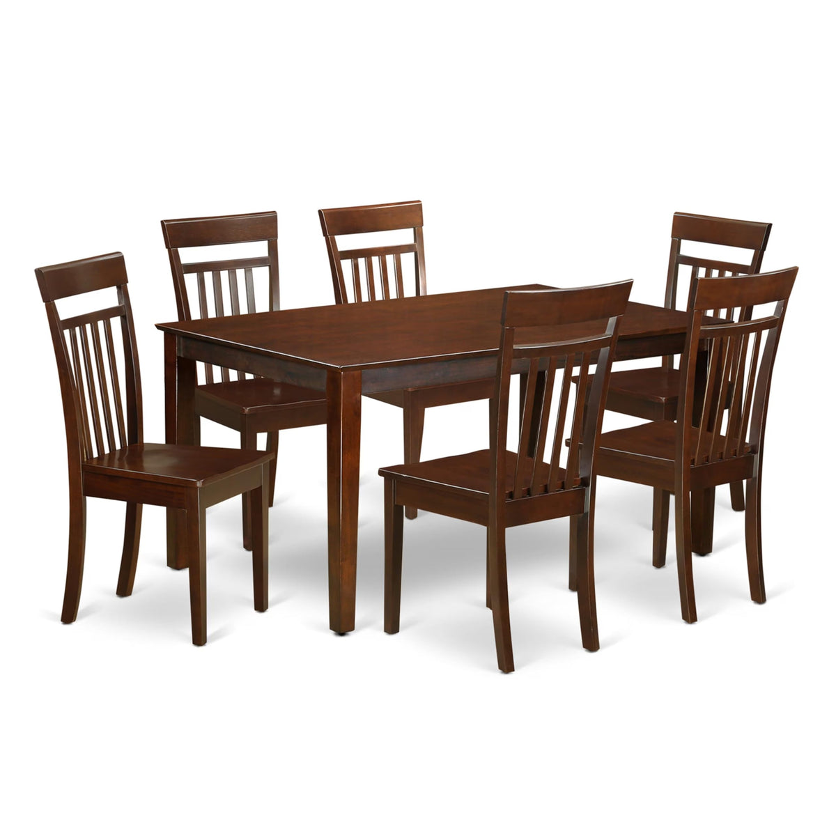 EAST WEST FURNITURE - CAP7S-MAH-W - 7 PIECE DINING TABLE SETIntensify the visual allure of your dining area with this captivating and contemporary dining table set. The set is comprised of a stylish small table and 6 exquisitely crafted dining chairs, perfect for enjoying meals with loved ones. The chairs are fashioned with wooden seats and slatted backs, ensuring superior comfort and support. The Mahogany rectangular tabletop and quadrilateral legs of the dinner table further enhance the overall sophistication of the set. The carpenter's dexterous handiwork ensures an opulent appearance and top-quality finish. The set is fashioned with top-tier Asian solid wood, commonly referred to as Rubber Wood, providing unparalleled durability and stability. The assembly and upkeep of the set are effortless, as it can be easily assembled and maintained with any furniture cleaner. Elevate the refinement of your dining space with this arresting and comfortable dining table set.PRODUCT FEATURES Frame Material: Asian Hardwood Chair Seat: Wooden Frame Color: Mahogany Table Legs: 4 Legs Table Top: Rectangular Measurements Of Kitchen Table: Length: 60; Width: 36; Height: 30. The Dimension of Elegant Wooden Chairs: Length: 20; Width: 17; Height: 38.Package Include: A Kitchen Table and 6 Dining Room Chairs