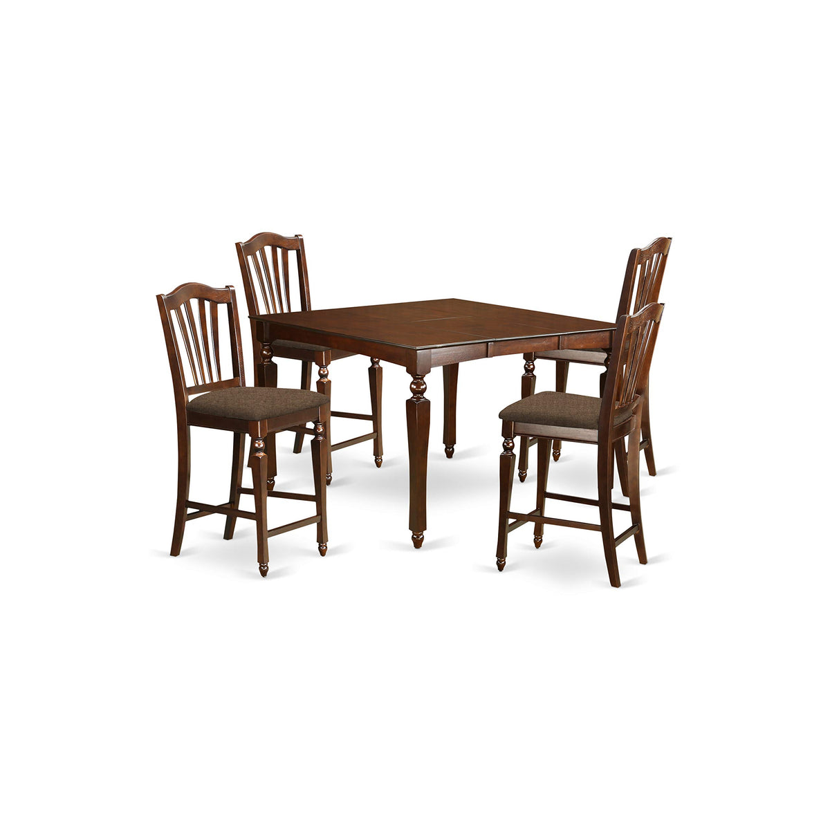 East West Furniture CHEL5-MAH-C Chelsea 5 Piece Counter Height Set Includes a Square Dining Room Table with Butterfly Leaf and 4 Linen Fabric Upholstered Chairs, 54x54 Inch
