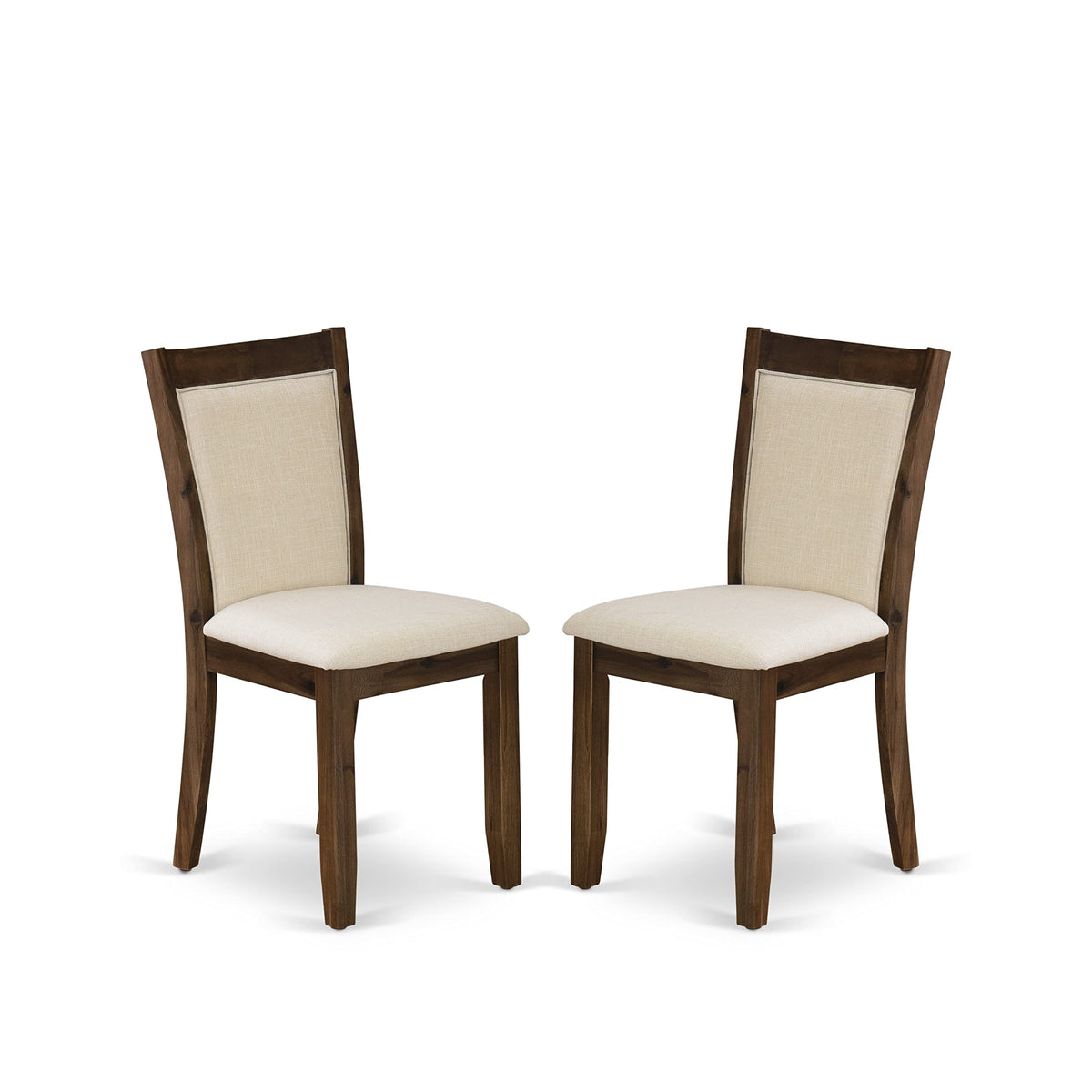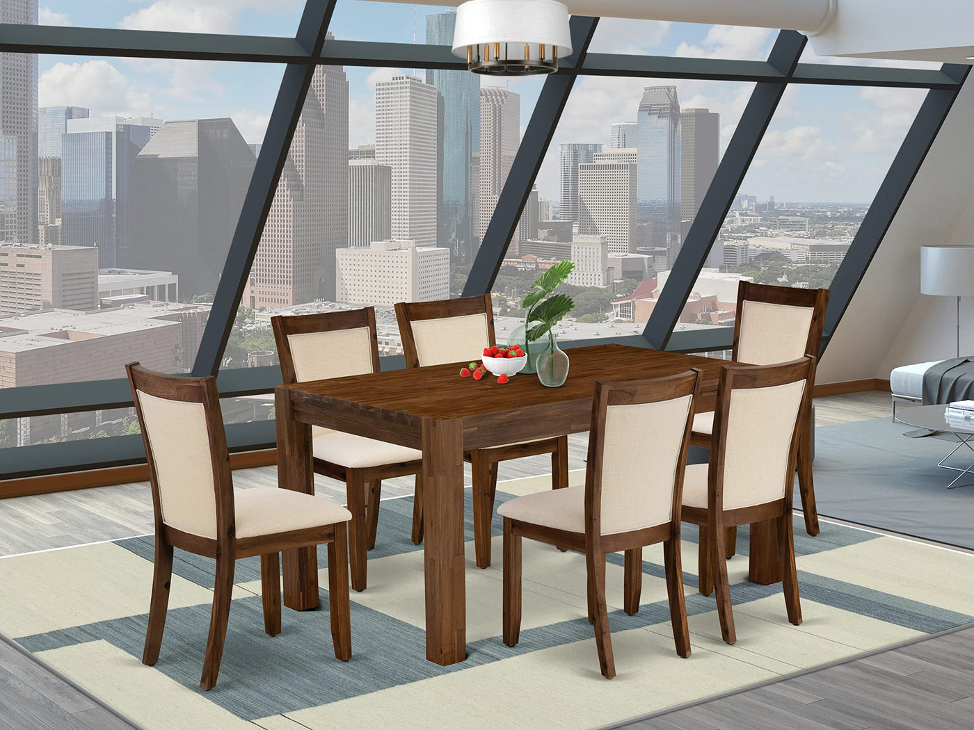 EAST WEST FURNITURE - CNMZ7-NN-32 - 7-PIECE DINNER SETThis 7-piece dining table set includes a dining table and 6 matching dining chairs, all made of fine rubber wood for quality and durability. The rectangular-shaped small kitchen table has innovative construction with unique details, while the linen fabric padded kitchen chairs add motivation to anyone who enters the kitchen. The wood table has 4 legs to provide the greatest steadiness during dinner time. The modern and elegant design of this dining room easily blends with any kitchen area. The padded seat and back of the modern chairs are upholstered with linen fabric, improving the dining room table layout. Our innovative modern dining table set is easy to clean using a wet cloth and always adds a distinctive charm to your dining space. The installation process of this luxurious dining set is not difficult and easy to use. The kitchen set comes with easy-to-follow guidelines and all essential tools included. By following the procedures in the guidebook, you can complete the installation in a short time.PRODUCT FEATURES: Frame Material: Asian Wood Table Shape: Rectangular Frame Color: Sand Blasting Antique Walnut Upholstery Material: Linen Fabric Chairs Fabric Color: Light Beige Chairs Back Style: Stylish High Back Weight Capacity: 300 lbs. Table Dimensions: Length: 60; Width: 36; Height: 30. Chairs Measurements: Length: 19.5; Width: 17.7; Height: 36.8.Package Includes: A Kitchen Table and 6 Wooden Chairs.