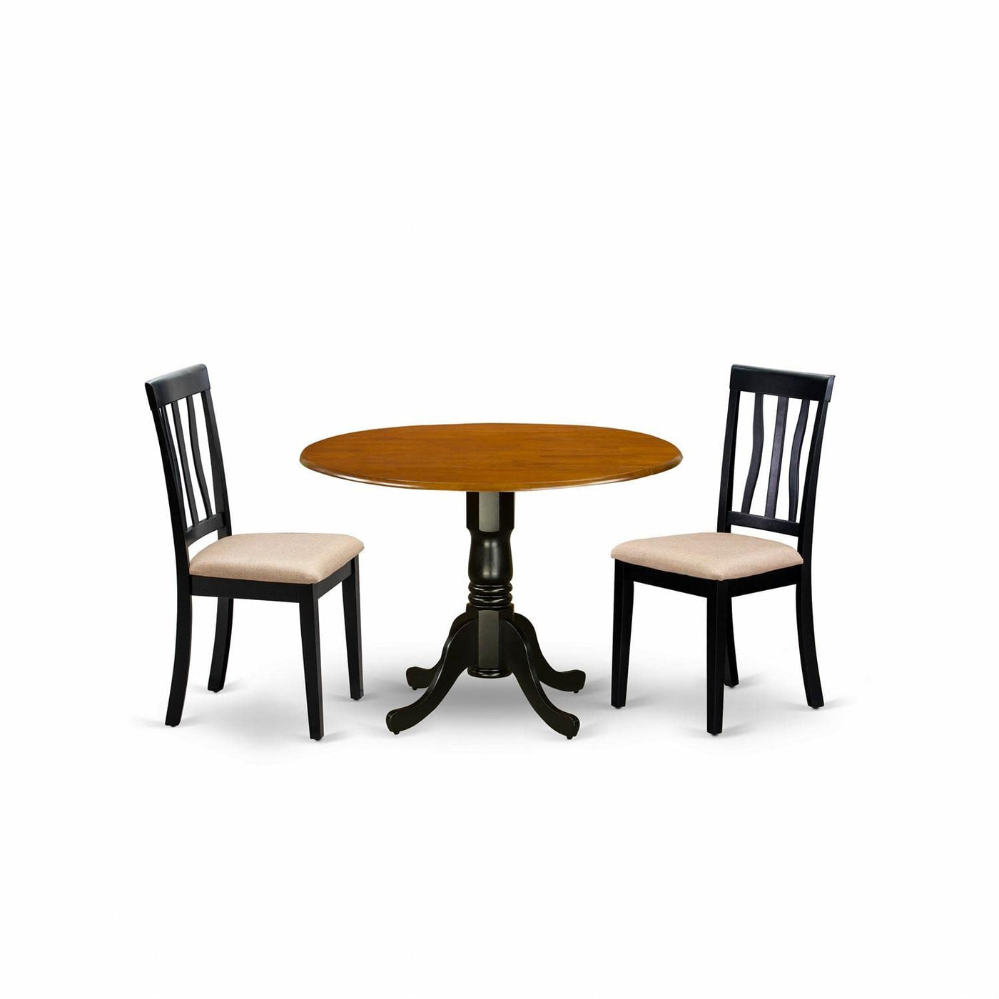 East West Furniture DLAN3-BCH-C 3 Piece Dining Room Table Set Contains a Round Kitchen Table with Dropleaf and 2 Linen Fabric Upholstered Dining Chairs, 42x42 Inch, Black & Cherry