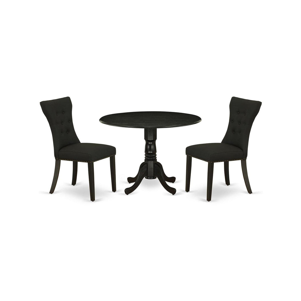 East West Furniture - Dlga3-Abk-24 - 3-Pc Dining Setrevamp Your Dining Area Or Kitchen Space With The 3-Piece Kitchen Table Set From East West Furniture. This Set Includes A Round Kitchen Table And 2 Fabric Chairs, Perfect For A Small Dining Area. The Table And Chairs Are Crafted From Durable Asian Rubber Wood, Designed To Withstand Years Of Use While Maintaining An Ergonomic And Comfortable Design. The Wirebrushed Black Finish Of The Dining Table Adds Elegance And Attractiveness To Your Home. The Chairs Have Soft Linen Fabric Cushions On The Seat And A Stylish Backrest Design With Solid Rubberwood Legs And An Asian Wood Body. The Dining Set Is Adaptable And Comfortable, Making It An Ideal Choice For Small Spaces. The Modern And Simplistic Design Is Accentuated By The Glossy Wirebrushed Black Finish.Product Features: Frame Material: Rubberwood Chair Seat Material: Linen Fabric Chairs Seat Color: Black Kitchen Chairs Leg Color: Wirebrushed Black Upholstered Dining Chairs Sizes: Length: 23; Width: 18; Height: 36. Mid Century Dining Table Sizes: Length: 42; Width: 42; Height: 29.5.Included: A Stunning Round Breakfast Table And 2 Fantastic Parsons Dining Chairs.