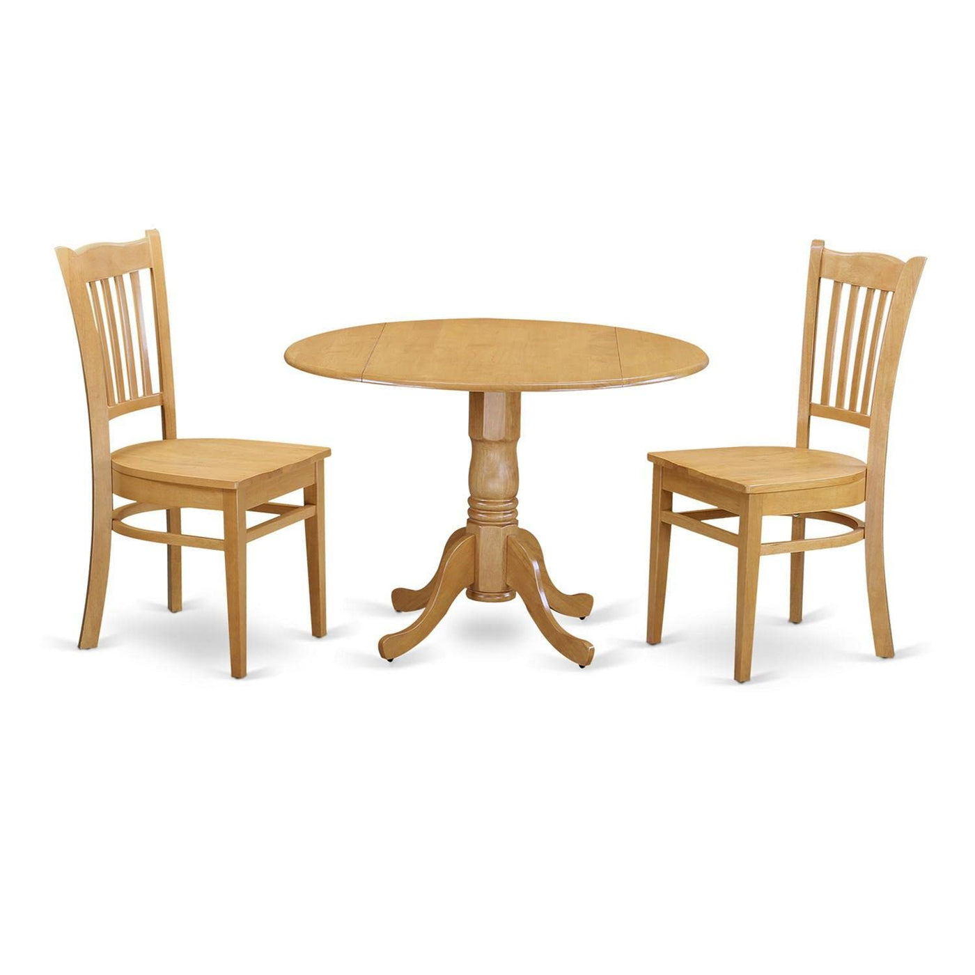 EAST WEST FURNITURE - DLGR3-OAK-W - MODERN DINING TABLE SETWith its stylish design and decor, our innovative table set is sure to enhance the appearance of any dining area. This 3-piece dining room set includes an elegant pedestal table and 2 matching dining chairs, adding simple and contemporary beauty to your home. Ideal for use in kitchens, kitchens, and dining areas, this modern kitchen set comfortably seats up to 2 people, making it great for family-style dinners or meals with friends. Its stylish design increases the elegance of any dining room, while the kitchen chairs add a touch of sophistication that seamlessly blends with any decor. The contemporary slatted back of the kitchen dining chair blends beautifully with the wooden seat, creating a sophisticated appearance. Our dinner table set is crafted from high-quality Asian wood material, also known as Rubber wood, ensuring durability and strength. The dining table set frame is crafted from high-quality wood to provide fantastic durability and strength.PRODUCT FEATURES: Frame Material: Rubber Wood Table Color: Oak Chair Color: Oak Seat Material: Wooden Back Style: Slatted Kitchen Chairs Sizes: Length: 21; Width: 18; Height: 37. Dining Table Sizes: Length: 42; Width: 42; Height: 29.5.Included: A Modern Table and 2 Kitchen Chairs.