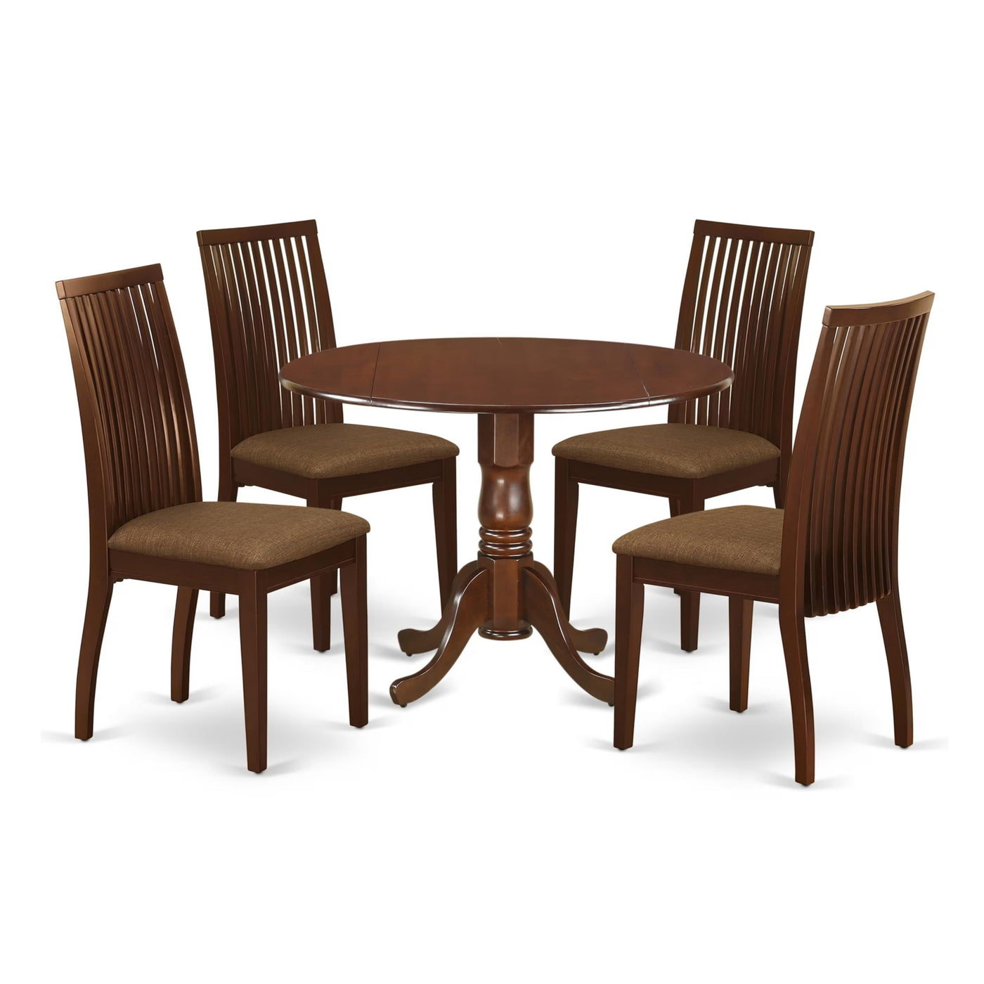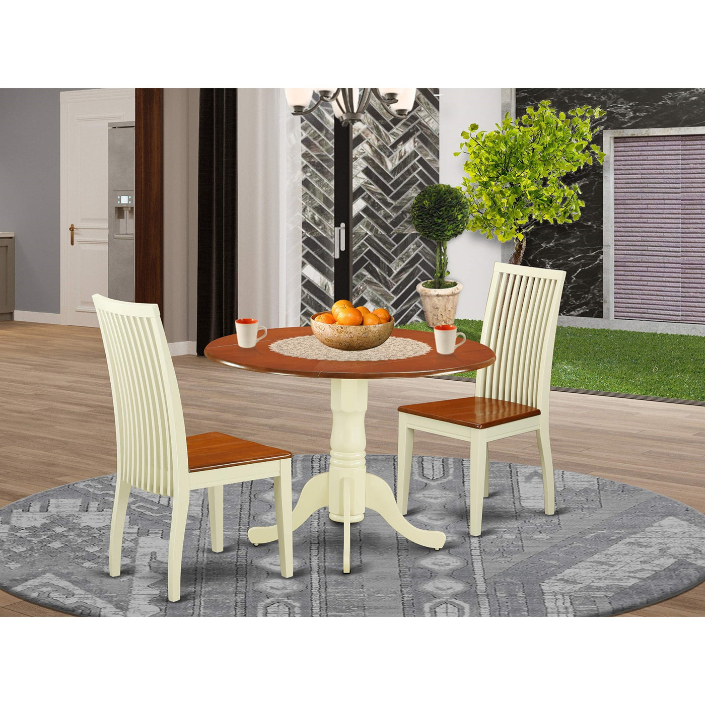 EAST WEST FURNITURE - DLIP3-BMK-W - KITCHEN TABLE SETIncluded in this kitchen set are 2 dining chairs and a Drops Leaf kitchen table. The modern chairs feature a Wooden Seat and Slatted Back, while the dinner table boasts a Drops Leaf top and Pedestal that adds elegance to your dining room. The dining chairs and wooden table were crafted by highly experienced carpenters who ensured a smooth and high-end finish for this modern dining table set. This high-quality dinner table set is perfect for any dining area, be it for casual home parties or intimate gatherings. We aim to offer both innovation and ease of assembly. You can easily assemble the self-storing Drops Leaf modern table and wooden dining chairs using the provided instructions. If you encounter any difficulties, do not hesitate to contact us. We prioritize customer satisfaction, so you can confidently purchase our products.PRODUCT FEATURES: Frame Material: Asian Wood Frame Color: Buttermilk and Cherry Table Top Style: Round Chair Back Style: Slatted Seat Material: Wood Chair Dimensions: Length: 21; Width: 18; Height: 39. Table Dimensions: Length: 42; Width: 42; Height: 29.5.Included in the Package: 2 Modern Dining Chairs and a Round Table.