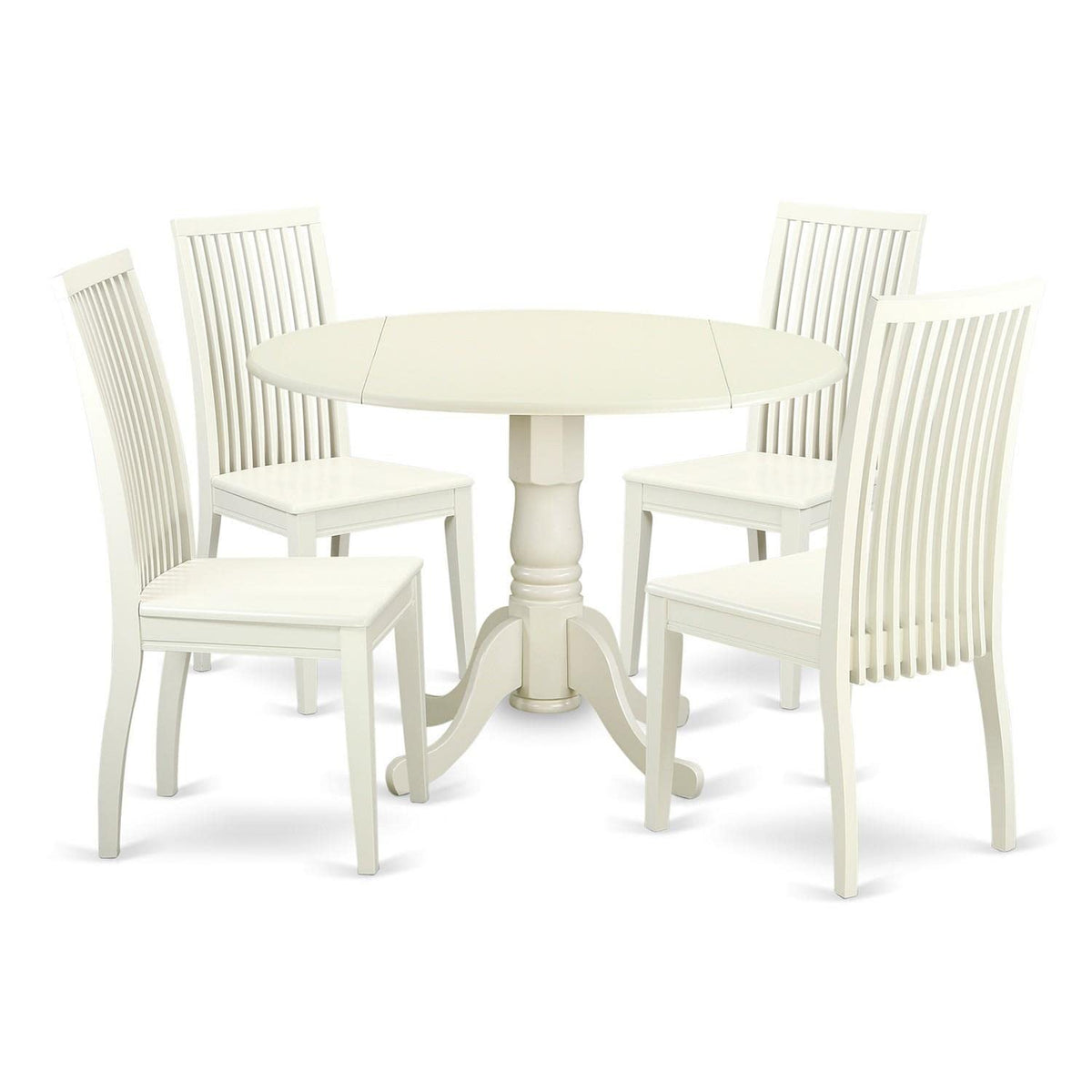 EAST WEST FURNITURE - DLIP5-LWH-W - KITCHEN DINING TABLE SETIncluded in this 5-piece kitchen set are 4 dining chairs and a modern Drops Leaf table. The chairs feature a Slatted Back and Wooden Seat, while the table boasts a Pedestal and a Drops Leaf top, adding elegance to your dining room. Our team of highly experienced carpenters has created this dining room set, ensuring a smooth and high-end finish. This high-quality dinner table set is perfect for any dining area, whether it's for casual home parties or intimate gatherings. We strive to provide innovation and ease of assembly. Assembling the self-storing Drops Leaf modern dining table and wooden dining chairs is a breeze with the provided instructions. If you encounter any difficulties, please do not hesitate to contact us. Our top priority is to keep our customers happy, so you can buy our products with confidence.PRODUCT FEATURES: Frame Material: Asian Wood Frame Color: Linen White (#f White) Table Top Style: Round Chair Back Style: Slatted Seat Material: Wood Chair Dimensions: Length: 21; Width: 18; Height: 39. Table Dimensions: Length: 42; Width: 42; Height: 29.5.Included in the Package: 4 Modern Dining Chairs and a Wooden Kitchen Table.