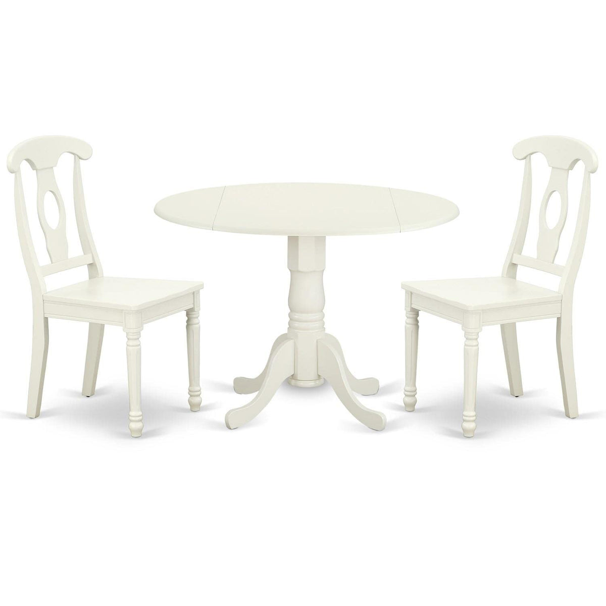 East West Furniture - Dlke3-Lwh-W - Wooden Dining Room Setthis Stunning Dining Set Boasts A Modern Design With Exclusive Appeal Perfect For Sophisticated Dining. The Fantastic Round Dining Table Features A Linen White Color That Complements A Variety Of Attractive Themes. The Smooth Color Of The Small Kitchen Table Subtly Reflects Light, Enhancing The Living Area And Showcasing The Dining Tables And Dining Chairs. The Drop-Down Leaf Can Be Easily Expanded On The Dining Table To Provide More Personal Space For Certain Occasions Or Great Parties. With A Single Bevel Edge And Rounded Finish, This Dining Room Table Is Perfect For Fitting Into Small Kitchen Spaces, Great For Compact Apartments. The Dining Chair Is Finished In A Linen White Color, Combined With A Solid Wooden Seat. The Antique Design Of The Dining Room Chairs Harmonizes With Your Dining Room, Ensuring That Meals Are Always Enjoyed In Style. The Chair Frames Are Engineered To Provide A Great Amount Of Comfort To Your Spine, Reducing The Chances Of Back Pain.Product Features: Material: Asian Hardwood Table Color: Linen White Chair Legs Color: Linen White Table Dimensions: Length: 42; Width: 42; Height: 29.5. Chair Dimensions: Length: 21; Width: 18; Height: 38.Include In The Package: 2 Dining Room Chairs And A Dining Table.