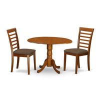 EAST WEST FURNITURE - DLML3-SBR-C - 3 PIECE KITCHEN TABLE SETThe stunning wooden dining table in this kitchen set can elevate the aesthetic appeal of any dining space, be it conventional or contemporary. With its elegant design and curves, this 5-piece classic kitchen dinner table set adds a touch of modernity to a traditional setup. The framework of the chairs and the dining table is crafted from high-quality Asian wood, also known as Rubber Wood, which ensures their durability and stability while being budget-friendly. The sturdy hardwood structure, coupled with a comfortable Linen Fabric Seat and Ladder back, makes these kitchen chairs and dining table not only visually appealing but also comfortable and supportive. The precise measurements of this dining table set make it easy to carry, clean, assemble, and relocate. The timeless design of this mid-century modern dining table set blends seamlessly with any home decor, while the Linen Fabric Seat and Ladder back of these dining chairs provide a comfortable seating experience for customers.PRODUCT FEATURES: Seat: Faux Leather; Kitchen Table Color: Saddle Brown; Dining Chairs Color: Saddle Brown; Dining Chairs Dimensions: Length: 22; Width: 17; Height: 38. Round Dining Table Dimensions: Length: 42; Width: 42; Height: 29.5.5;Includes: 2 Wooden Dining Room Chairs and 1 Dining Room Table.