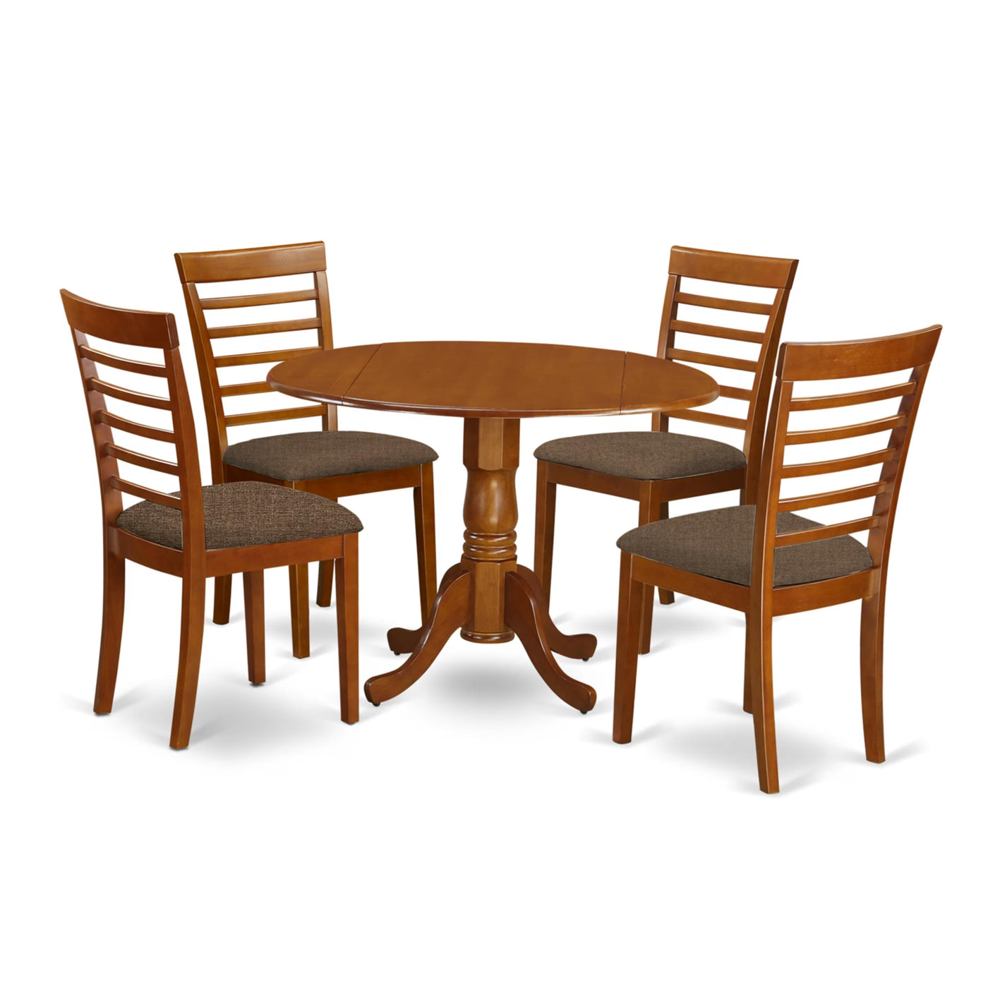 East West Furniture DLML5-SBR-C 5 Piece Dinette Set for 4 Includes a Round Dining Room Table with Dropleaf and 4 Linen Fabric Upholstered Dining Chairs, 42x42 Inch, Saddle Brown