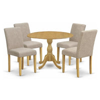 East West Furniture DMAB5-OAK-04 5 Piece Dining Set Includes a Round Dining Room Table with Dropleaf and 4 Light Tan Linen Fabric Upholstered Parson Chairs, 42x42 Inch, Oak