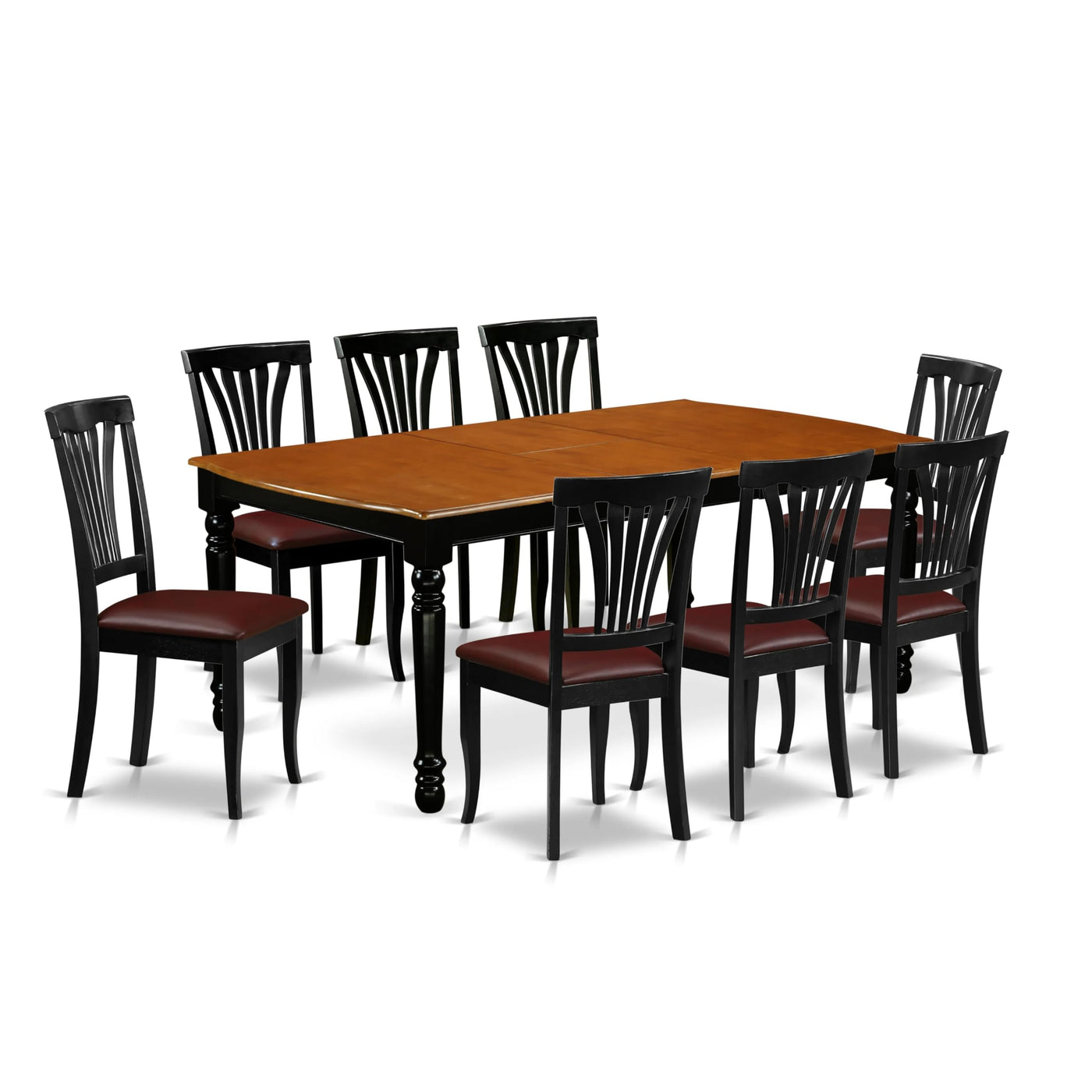EAST WEST FURNITURE - DOAV9-BCH-LC - KITCHEN DINING TABLE SETThis sophisticated 9-piece mid-century dining set comprises a wooden butterfly leaf table and 8 exquisite kitchen chairs. This charming rectangular dining table set is a tasteful addition to any kitchen decor, with its striking Black & Cherry color combination. The set features premium, long-lasting colors that ensure durability while enhancing its aesthetic appeal. The chairs are adorned with comfortable and elegant Faux Leather seats, providing a delightful seating experience. Overall, this dining set is a sophisticated and stylish choice for any discerning homeowner. The addition of this dining set to your dining room is sure to elevate its aesthetic appeal. Our team of highly skilled carpenters has meticulously crafted these dining chairs and tables to ensure a smooth, high-end finish. This dining set is of premium quality and is an ideal fit for any dining area, whether it's a casual home gathering or an intimate event. We are committed to providing both innovation and convenience, and you can effortlessly assemble the self-storing butterfly leaf modern kitchen table and dining chairs by following the included instructions. If you encounter any difficulties during assembly, please do not hesitate to contact us for assistance. Our products are guaranteed to meet your expectations, as customer satisfaction is our top priority.PRODUCT FEATURES: Frame Material: Asian Wood Frame Color: Black and Cherry Table Top Style: Rectangular Chair Back Style: Slatted Seat Material: Faux Leather Chair Dimensions: Length: 22; Width: 18; Height: 36. Table Dimensions: Length: 78/60; Width: 42; Height: 30.Included in the Package: 8 Kitchen Chairs and a Kitchen Table.