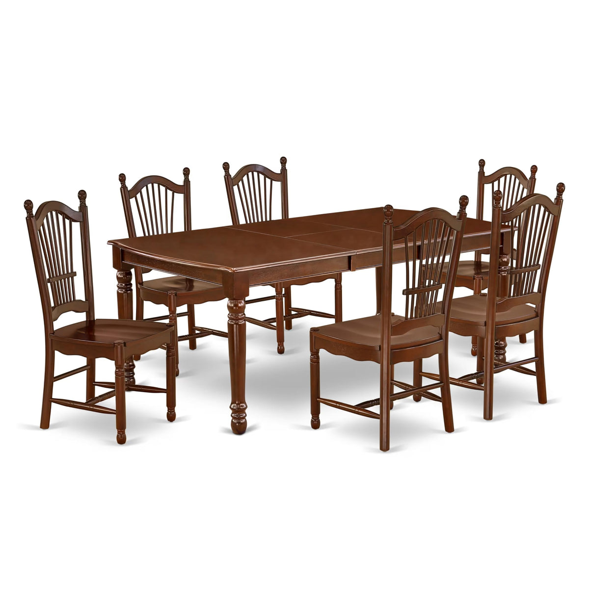 East West Furniture - Dodo7-Mah-W - Dining Room Setthis 7-Piece Modern Dining Set Is Comprised Of 6 Elegantly Designed Chairs And A Dining Table Featuring A Butterfly Leaf Extension. The Rectangular Kitchen Table Boasts A Comfortable And Stylish Mahogany Color That Imbues The Dining Area With A Relaxing And Congenial Feel. The Kitchen Chairs Have Seats Made Of Solid Wood That Can Be Tailored To Individual Preferences And Aesthetics. The Dining Chair Frames Are Engineered To Provide Superior Spinal Support, Reducing The Likelihood Of Back Pain. Its Smooth Mahogany Finish Renders It A Versatile Addition To Any Kitchen Or Dining Room Decor. The Table Is Made Of Prime-Quality Rubber Wood, Also Referred To As Asian Hardwood. The Dover Kitchen Chair, Finished In The Same Mahogany Color, Features A Solid Wood Top That Lends An Exquisite Modern Touch. The Standard Shape, Size, And Design Of The Dining Area Are Significantly Enhanced By This Contemporary, Budget-Friendly, Durable, And Comfortable Dining Set. If You Seek A Memorable Dining Experience With Loved Ones, This Dining Set Is An Excellent Choice.Product Features: Material: Asian Hardwood Color: Mahogany Dimensions: Length: 78/60; Width: 42; Height: 30. Dimensions: Length: 21; Width: 18; Height: 39. Weight Capacity: 300 Lbsincludes: A Rectangular Table And 6 Wooden Chairs "