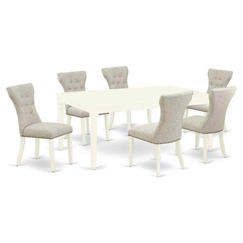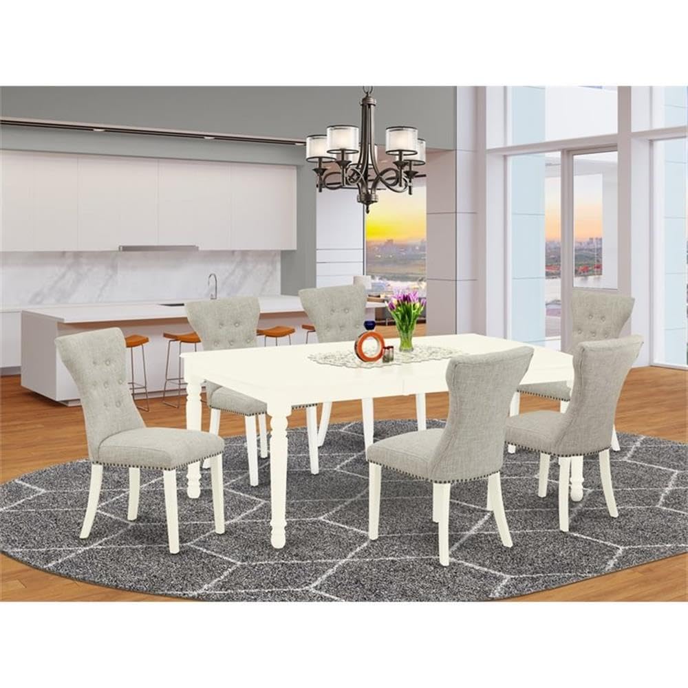 East West Furniture - Doga7-Lwh-35 - 7-Pc Kitchen Setthis Exceptional Dining Room Set Comprises Of A Four-Legged Dining Table And 6 Splendid Kitchen Chairs. The Breakfast Table Is Made From Solid Wood With A Linen White Finish, While The Dining Room Chairs Are Upholstered With Doeskin Fabric, Boasting A High Back For Added Elegance. Our High-Quality Chairs Are Designed To Offer Maximum Comfort And Relaxation During Meal Times. The Modern Butterfly Leaf Dining Table Is Crafted From Premium Quality Rubber Wood, With A Weight-Bearing Capacity Of Up To 300 Lbs. The Parson Chairs Feature A Wooden Structure And Luxury Foam Seats Covered With Linen Fabric, Making Them Perfect For Spending Quality Time With Family And Friends. At East West Furniture, We Always Strive To Offer Modern And Easy-To-Assemble Furniture. This Rectangular Dining Table Set Is Suitable For Both Your Dining Area And Kitchen, Making It Perfect For Casual Home Parties. Choose East West Furniture For A Delightful Modern Furniture Experience.Product Features: Fabric Color: Doeskin Wood Color: Linen White Fabric: Linen Fabric Dining Chairs Dimension: Length: 23; Width: 18; Height: 36. Modern Dining Table Dimension: Length: 78/60; Width: 42; Height: 30.Package Include: 6 Parson Dining Chairs And A Dinner Table