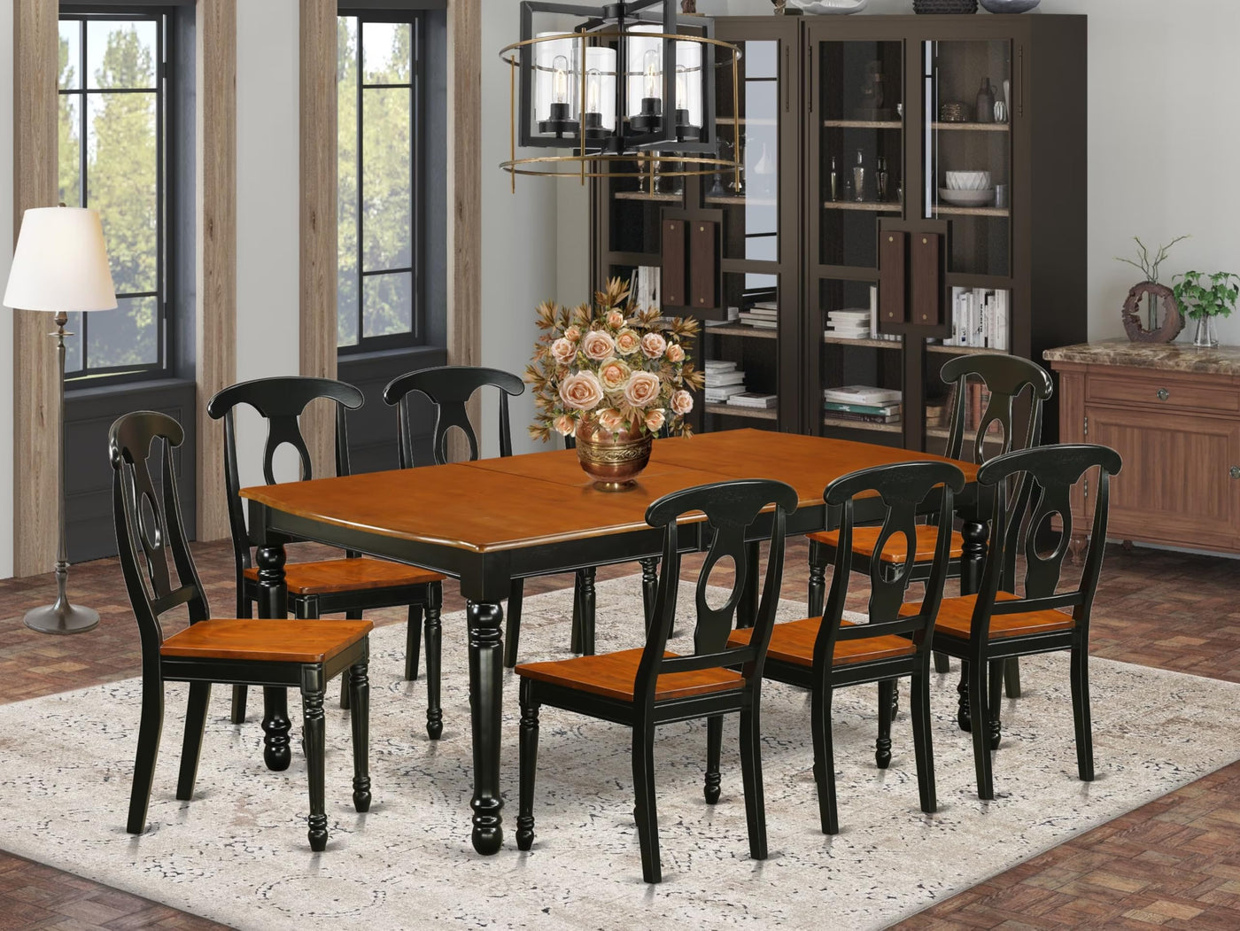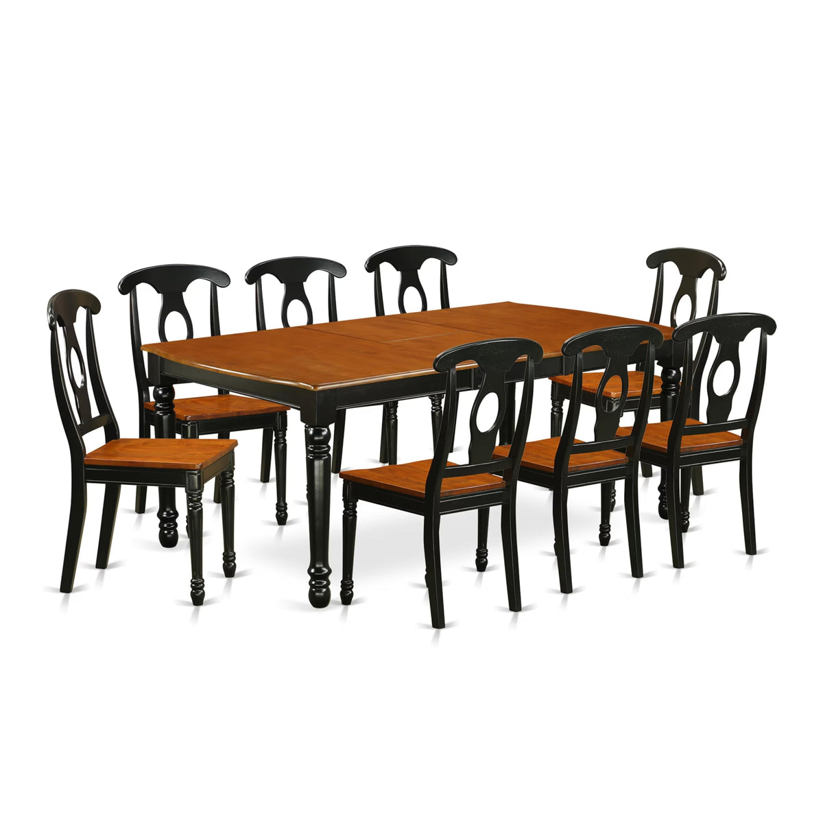 EAST WEST FURNITURE - DOKE9-BCH-W- KITCHEN TABLE SETThis 9-piece mid-century dining table set comprises of a butterfly leaf dinner table and 8 dining room chairs, all boasting a Wooden Seat and Napoleon Back design. The table is accentuated by a butterfly leaf top and 4 legs, imparting a touch of elegance to your dining room. Crafted by highly skilled carpenters, this dining set showcases a sophisticated and upscale finish, owing to the use of premium Black and Cherry Finish wood. The result is a visually striking and remarkably durable furniture collection that is perfect for hosting casual home parties or intimate gatherings in any dining area. We have prioritized innovation and convenience, ensuring that you can easily assemble the self-storing butterfly leaf modern table and wooden dining chairs using the provided instructions. Trust in your purchase, as our primary objective is to keep our customers content.PRODUCT FEATURES: Frame Material: Asian Wood Frame Color: Black and Cherry Table Top Style: Rectangular Chair Back Style: Napoleon Seat Material: Wood Chair Dimensions: Length: 21; Width: 18; Height: 38. Table Dimensions: Length: 78/60; Width: 42; Height: 30.Included in the Package: 8 Modern Dining Chairs and a Rectangular Table.