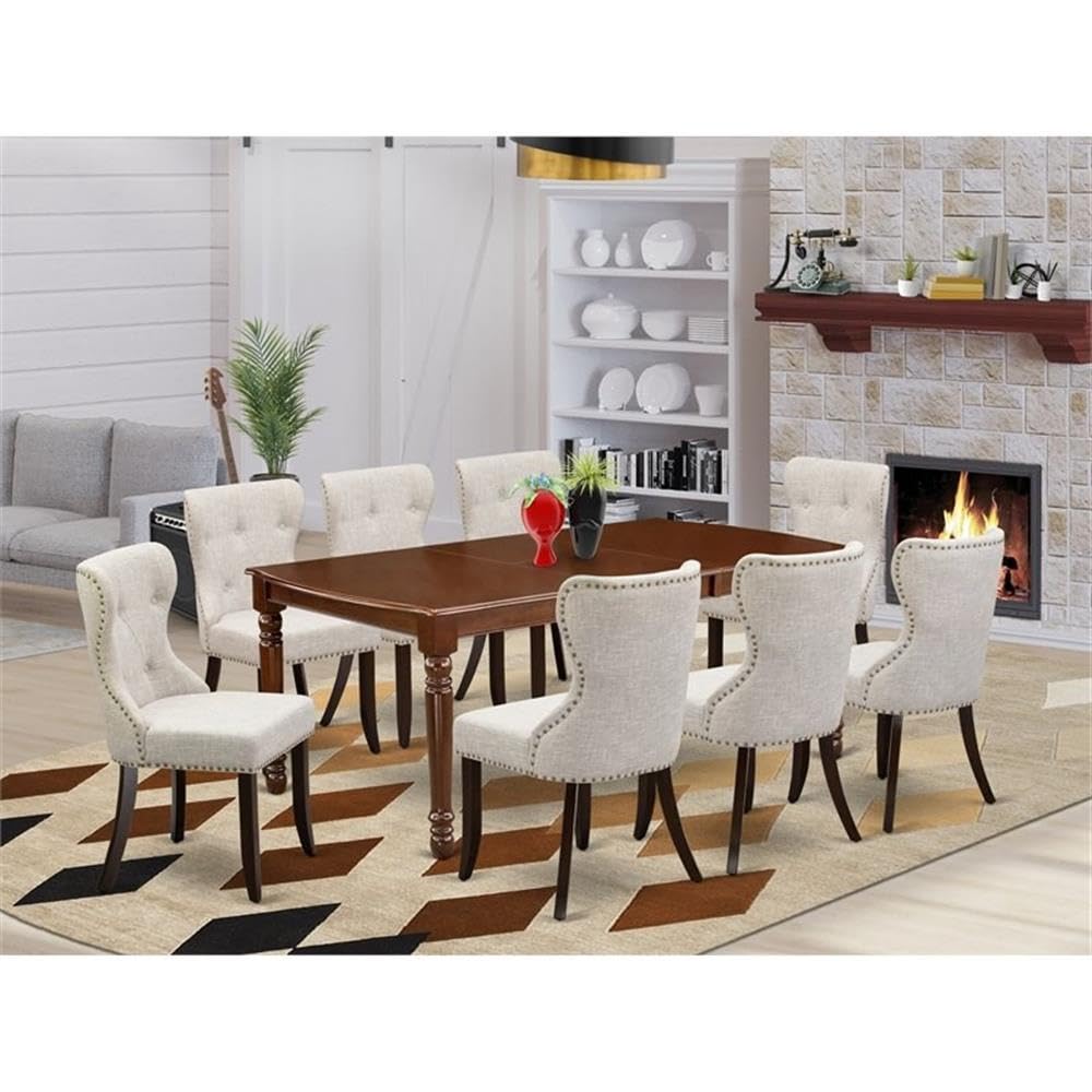 EAST WEST FURNITURE - DOSI9-MAH-35- 9-PIECE DINING TABLE SETThe 9-piece kitchen set is exquisitely designed and adds a touch of beauty to your dining room. With lovely curves and details, the set has a modern twist while maintaining its traditional appeal. This exquisite dining set boasts indoor dining chairs upholstered in a cozy doeskin-colored linen fabric, paired with a stunning dining table constructed from high-quality mahogany-finished wood and designed with a 2-side 18-inch butterfly leaf. The expertly crafted combination of these superior materials results in a harmonious color scheme that enhances the elegant appearance of any kitchen. Crafted from high-quality Asian wood, the parson chairs and the 18 butterfly rectangle kitchen table are both sturdy and stable. The dining table has a robust hardwood structure, and the upholstered seat and stylish back of the chairs provide comfortable support. This kitchen set boasts of modern style, stability, and comfort, and its lightweight makes it easy to move, clean, assemble, and reposition. The classic design of the two-side 18 butterfly rectangle dining table seamlessly complements any home decor, and the smooth Linen Fabric seat and stylish back of the kitchen chairs offer a comfortable seating experience.PRODUCT FEATURES: Chair Leg Wood Color: Mahogany Chair Fabric Material: Linen Chair Fabric Fabric Color: Doeskin Two-side 18 butterfly rectangle wooden table color: Mahogany Parson chairs dimensions: Length: 21.5; Width: 19.5; Height: 35.5. Wood kitchen table dimensions: Length: 78/60; Width: 42; Height: 30.Package includes: 8 dining chairs and a two-side 18 butterfly rectangle dining room table