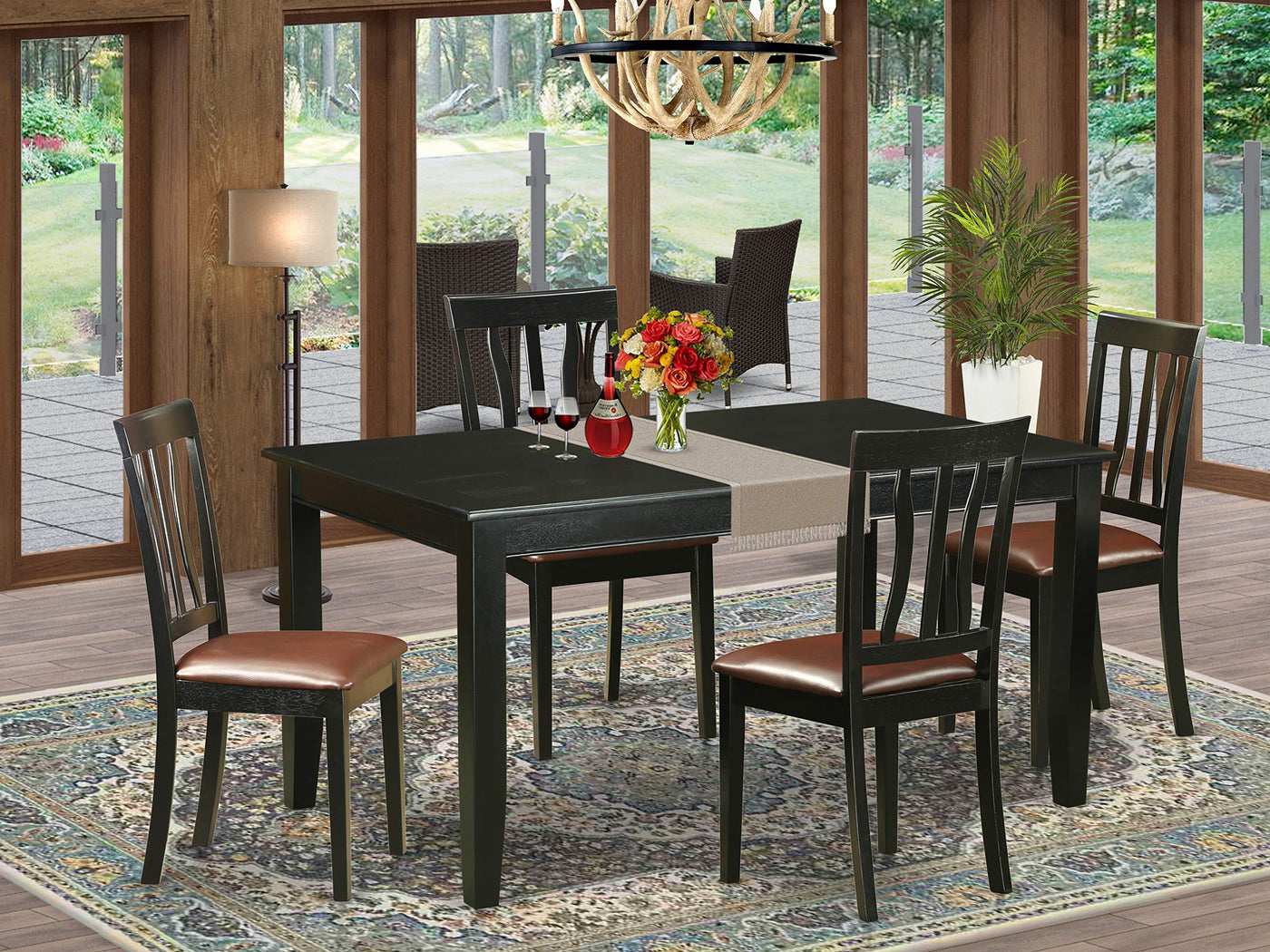 EAST WEST FURNITURE - DUAN5-BLK-LC - DINNER TABLE SETThis 5-piece kitchen set is composed of four dining room chairs and a contemporary table, impeccably crafted to exude sophistication and refinement. The dining chairs are designed with a slatted back and feature a comfortable faux leather seat, while the table boasts a rectangular top and four legs, resulting in an understated yet elegant design that enhances the aesthetic appeal of any dining room. Our highly experienced carpenters have meticulously crafted these chairs and table to deliver a smooth and high-end finish, culminating in a top-quality dinner table set that is ideal for any dining area. The versatility of this modern dining table set is perfect for casual home gatherings or intimate occasions, reflecting our commitment to providing innovative and adaptable solutions to our customers. We provide detailed instructions for easy assembly, and our customer support team is readily available to address any concerns or questions. Our dedication to ensuring customer satisfaction is reflected in our product guarantee, as we stand behind the quality and craftsmanship of our products with confidence.PRODUCT FEATURES: Frame Material: Asian Wood Frame Color: Black Table Top Style: Rectangular Chair Back Style: Slatted Seat Material: Faux Leather Chair Dimensions: Length: 20; Width: 18; Height: 38.5. Table Dimensions: Length: 60; Width: 36; Height: 30.Included in the Package: 4 Modern Dining Chairs and a Modern Table.