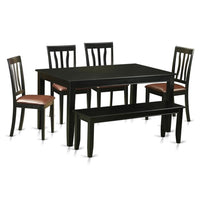 EAST WEST FURNITURE - DUAN6-BLK-LC - DINNER TABLE SETThis 6-piece kitchen set includes 4 modern dining chairs, a kitchen bench, and a rectangular dining table, all designed to enhance the grace of your dining room. The modern chairs feature a Faux Leather seat and a Slatted Back, while the dining bench has a Faux Leather seat and the dinner table has 4 legs, making it a stylish and practical addition to any dining area. Crafted by highly experienced carpenters, this high-quality dinner table set boasts a smooth and high-end finish that reflects our commitment to innovation and ease of assembly. Ideal for casual home parties or intimate gatherings, this kitchen dining table set comes with clear instructions that make assembly a breeze. If you have any questions or concerns, feel free to contact us - our top priority is keeping our customers happy and satisfied. In summary, if you're looking for a stylish and practical kitchen set that will enhance the grace of your dining room, look no further than this 6-piece set from East West Furniture. With modern dining chairs, a kitchen bench, and a rectangular dining table, all crafted to the highest standards, you can buy our products with confidence and enjoy a beautiful and functional dining space for years to come.PRODUCT FEATURES: Frame Material: Asian Wood Frame Color: Black Table Top Style: Rectangular Chair Back Style: Slatted Seat Material: Faux Leather Chair Dimensions: Length: 20; Width: 18; Height: 38.5. Table Dimensions: Length: 60; Width: 36; Height: 30. Bench Dimension: Length: 51; Width: 15; Height: 17.Included in the Package: 4 Dining Chairs, a Rectangular Bench and a Dining Table.
