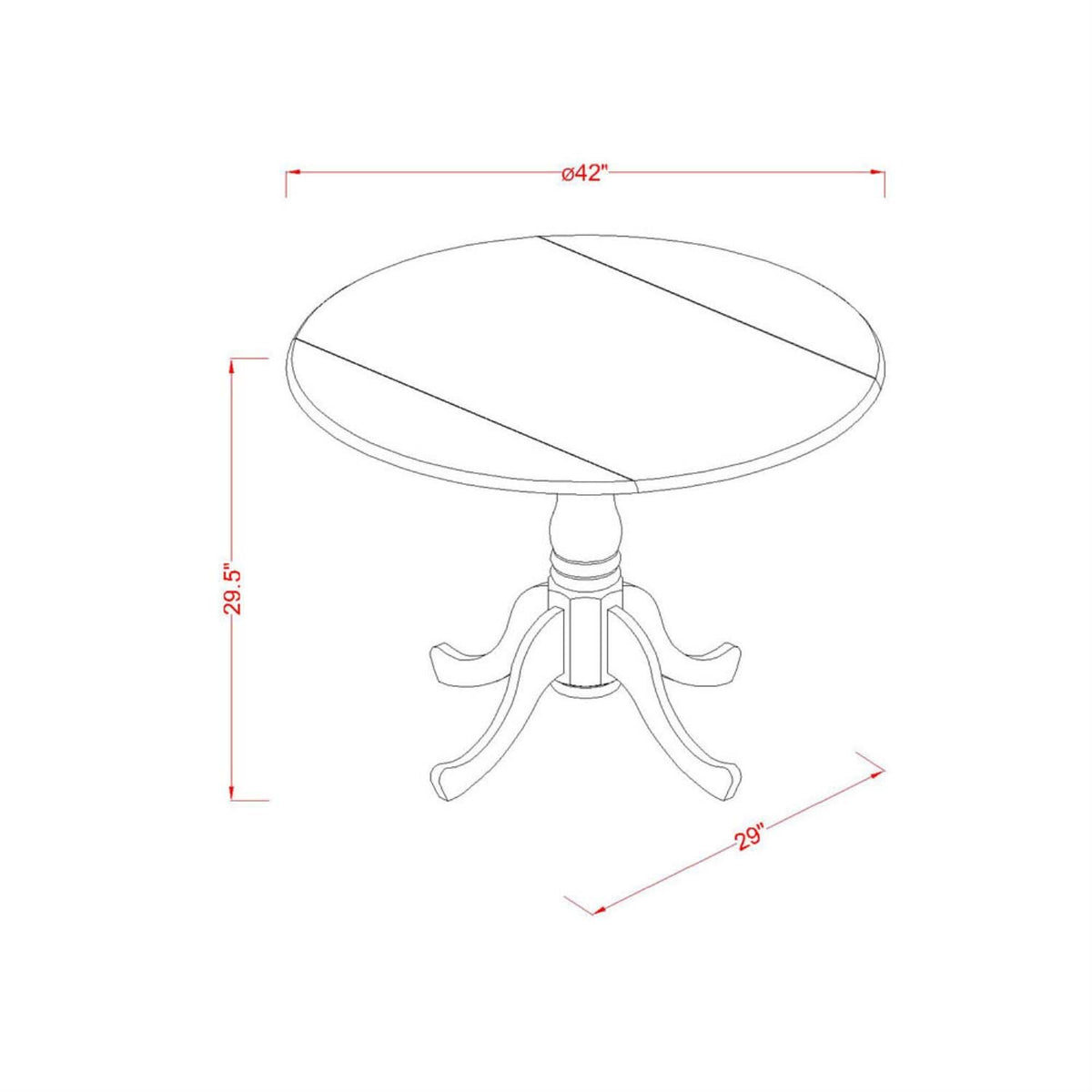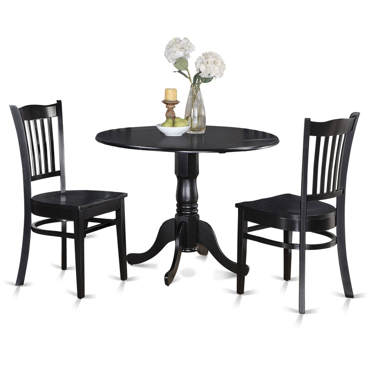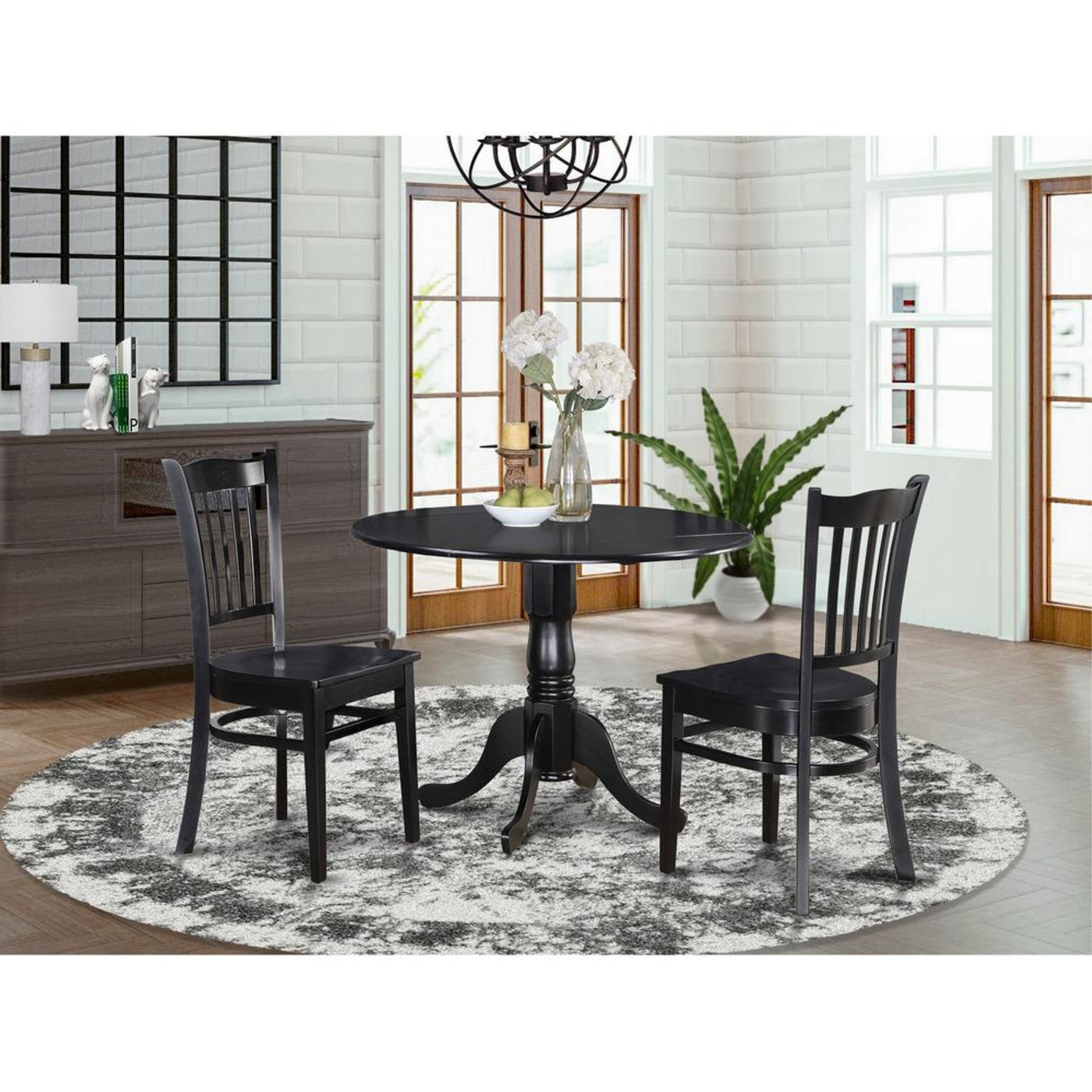 EAST WEST FURNITURE - DLGR3-BLK-W - DINING ROOM SETWith its stylish design and décor, our modern dining table set is sure to enhance the appearance of any dining area. This 3-piece dining room set includes a chic modern table and 2 matching dining chairs, adding simple and contemporary beauty to your home. Perfect for use in kitchens, kitchens, and dining areas, this modern kitchen set comfortably seats up to 2 people, making it great for family-style dinners or meals with friends. Its stylish design increases the elegance of any dining room, while the kitchen chairs add a touch of sophistication that seamlessly blends with any decor. The slatted back of the dining chair is a great match for the wooden seat, creating a refined look. Made from high-quality Asian wood material, also known as Rubber wood, this table set is built to last. The dining table set frame is crafted with high-quality wood, ensuring fantastic durability and strength.PRODUCT FEATURES: Frame Material: Rubber Wood Table Color: Black Chair Color: Black Seat Material: Wooden Back Style: Slatted Kitchen Chairs Sizes: Length: 21; Width: 18; Height: 37. Dining Table Sizes: Length: 42; Width: 42; Height: 29.5.Included: A Modern Pedestal Table and 2 Kitchen Chairs.
