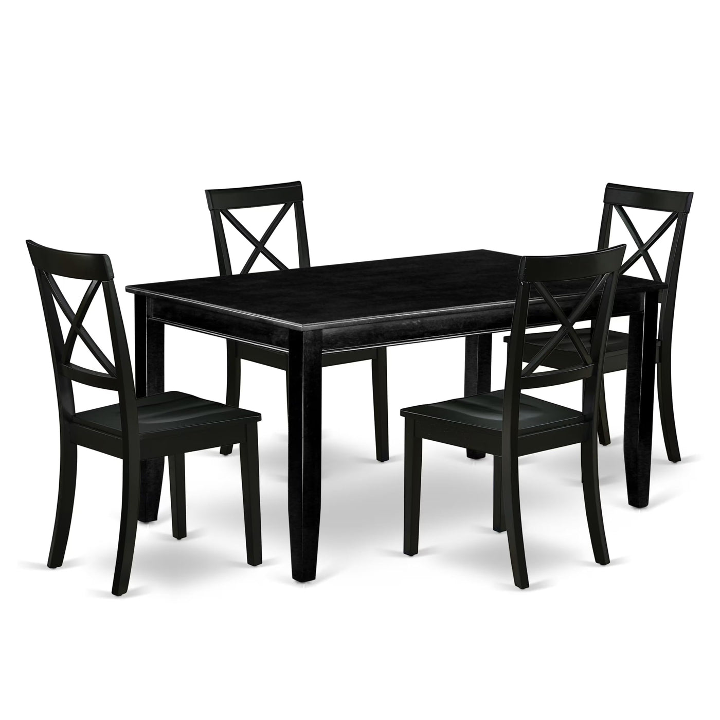 East West Furniture - Dubo5-Blk-W - Dining Room Setthis Rectangular Wooden Table Is A Versatile Piece Of Furniture That Can Complement Both Traditional And Contemporary Dining Room Decor. With Its Exceptional Design, This Wooden Dining Table Set Adds A Touch Of Beauty To Your Dining Space. The 5-Piece Traditional Kitchen Table Set Features Intricate Curves And Details That Add A Modern Twist To Its Overall Classic Look. Crafted From High-Quality Asian Wood (Rubber Wood), The Body Of These Unique Wooden Dining Chairs And The Dinner Table Offers Exceptional Sturdiness And Stability. The Modern, Sturdy Solid Wood Structure, Comfortable Wooden Seat, And X-Back, And Efficient Rectangular Dining Table Create An Innovative And Stylish Look That Provides Excellent Stability And Comfortable Back Support. This Kitchen Dining Table Set Is Easy To Handle And Move Around, Thanks To Its Excellent Dimensions. Moreover, The Classic Styles Of This Special Wood Table Blend Seamlessly With Any Home Decor, While The Smooth Wooden Seat And X-Back Of These Wooden Dining Chairs Ensure User Comfort. In Summary, This Exceptional Wooden Dining Table Set Is A Perfect Addition To Your Dining Room. With Its Innovative Design And Exceptional Sturdiness, This Set Offers Both Style And Comfort, Providing A Fantastic Impression Of Dining Style That Blends Effortlessly With Any Decor.Product Features: Frame Material: Asian Hardwood Chair Seat: Wooden Table Color: Black Chairs Dimensions: Length: 60; Width: 36; Height: 30. Table Dimensions: Length: 21; Width: 18; Height: 38.Includes: 4 Wood Dining Chairs And 1 Kitchen Table