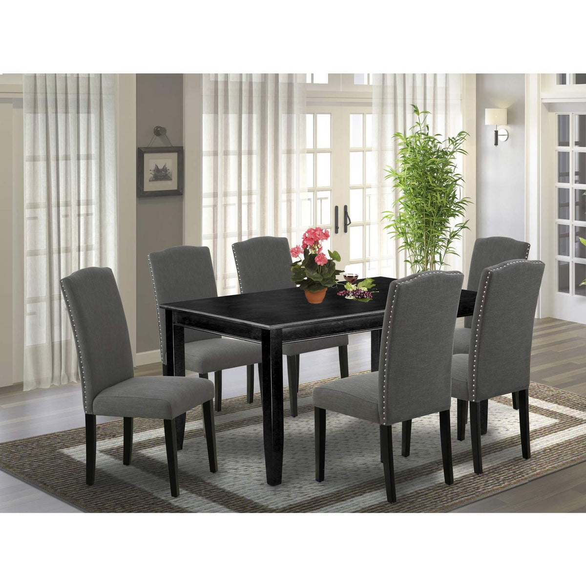 East West Furniture - Duen7-Blk-20 7-Pieces Nook Kitchen Table Setintroduce Elegance To Your Dining Room With This Sophisticated 7-Piece Dining Set. Impeccably Designed, The Set Comprises A Remarkable 4-Legged Wooden Table And 6 Exquisite Parson Dining Chairs. Meticulously Crafted From Premium Linen Fabric, The Chairs Offer Unparalleled Comfort And An Exceptional Seating Experience. The Timeless Style Of This Wooden Kitchen Set Will Elevate The Aesthetic Appeal Of Your Dining Area, Leaving A Lasting Impression. Distinguished By A Black Hardwood Wood Dining Table And Body, The Set Is Adorned With Captivating Dark Gotham Grey Linen Fabric Seats And High Backs On The Chairs, Exuding A Sense Of Refined Sophistication. The Use Of Asian Wood, Also Known As Rubberwood, Ensures Remarkable Durability And Longevity For Our Modern Kitchen Set. Every Detail Has Been Attended To By Highly Skilled Carpenters, Resulting In A Flawlessly Smooth And High-End Finish. Assembling This Contemporary Kitchen Set Is A Seamless Process, Thanks To The Comprehensive Guidance Included In The Package. Additionally, Maintaining Cleanliness Is Effortless, As The Small Kitchen Set Is Designed To Be Easily Cleaned. With The Use Of Any Furniture Cleaner, You Can Restore Its Pristine Condition In No Time. The Rectangular Shape Of The Dining Set Facilitates Effortless Cleaning, Providing A Consistently Fresh And Appealing Look.Product Features: Frame Material: Material Fabric: Linen Fabric Fabric Color: Dark Gotham Grey Wood Color: Black Wood Dining Table Dimension: Length: 60; Width: 36; Height: 30. Kitchen Parson Chairs Proportions: Length: 24.5; Width: 19; Height: 40.5.Package Include: 6 Gorgeous Upholstered Dining Chairs And A Wonderful Dining Table.