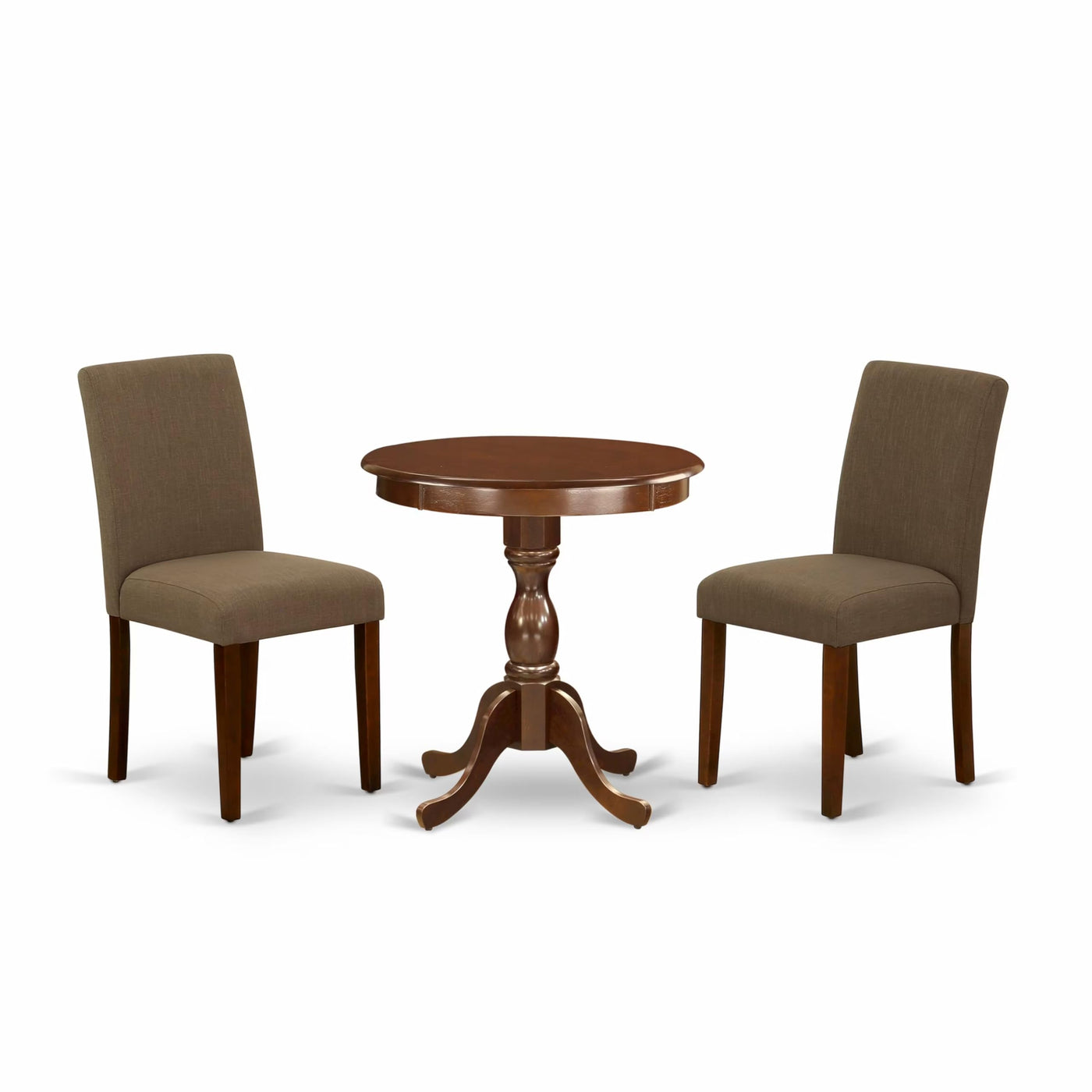 East West Furniture - Esab3-Mah-18 - 3-Pc Kitchen Setintroducing Our Exquisite Dining Room Set, Featuring 2 Modern Dining Room Chairs And A Dining Table. The Kitchen Table Showcases A Round Tabletop And Attractive Legs. Our Sophisticated Parson Chairs Are Characterized By Refined Coffee Fabric Upholstery And An Elegant High Chair Back Design, Exuding Magnificence. The Mahogany Finish Dining Table Top, Paired With The Coffee Fabric Seat, Offers Substantial Support For Weights Up To 300 Lbs. The Chairs' Hardwood Frame And Cushioned Back Ensure Durability And Adequate Support. These Simple Yet Charming Parson Dining Chairs Enhance The Style Of Your Dining Room, While The Modern Dining Table Set Adds A Touch Of Chic To Your Home. With Its Contemporary Twist On A Classic Design, This Captivating Set Brings Life To Any Space. Refreshing Your Dining Area Is Effortless By Swapping Out The Chairs And Wooden Table. Assembly Is A Breeze, Taking Approximately One Hour, And All Necessary Hardware Is Included. The Lightweight Parson Chairs Are Easy To Carry Or Move Around. Enjoy The Convenience And Style Of The East West Furniture Dining Set!Product Features: Frame Material: Rubber Wood Fabric: Linen Fabric Cushion Material: Foam Fabric Color: Coffee Frame Color: Mahogany Dining Room Chairs Dimensions Are: Length: 22; Width: 17.20; Height: 35.20. Wooden Dining Table Dimensions Are: Length: 30; Width: 30; Height: 30.Included In The Package: 1 Beautiful Wooden Dining Table And 2 Fabulous Kitchen Chairs.