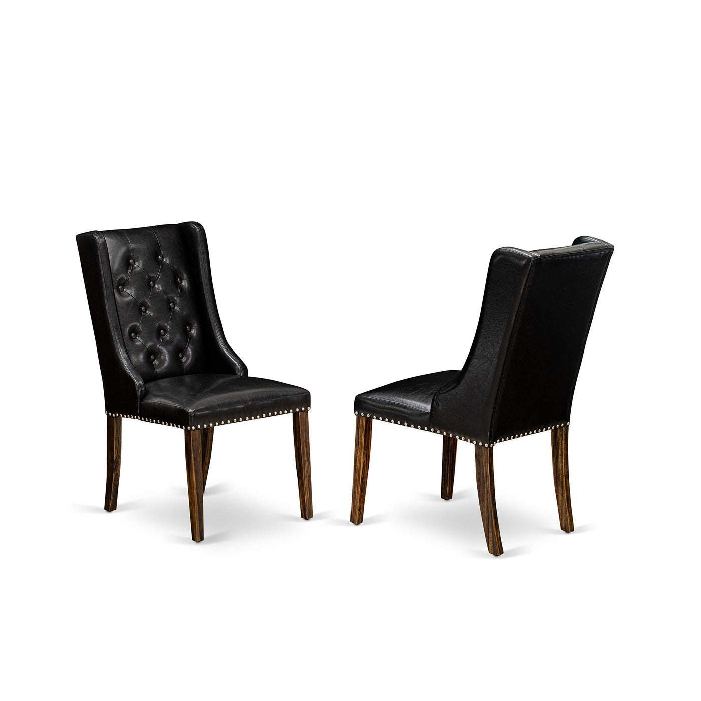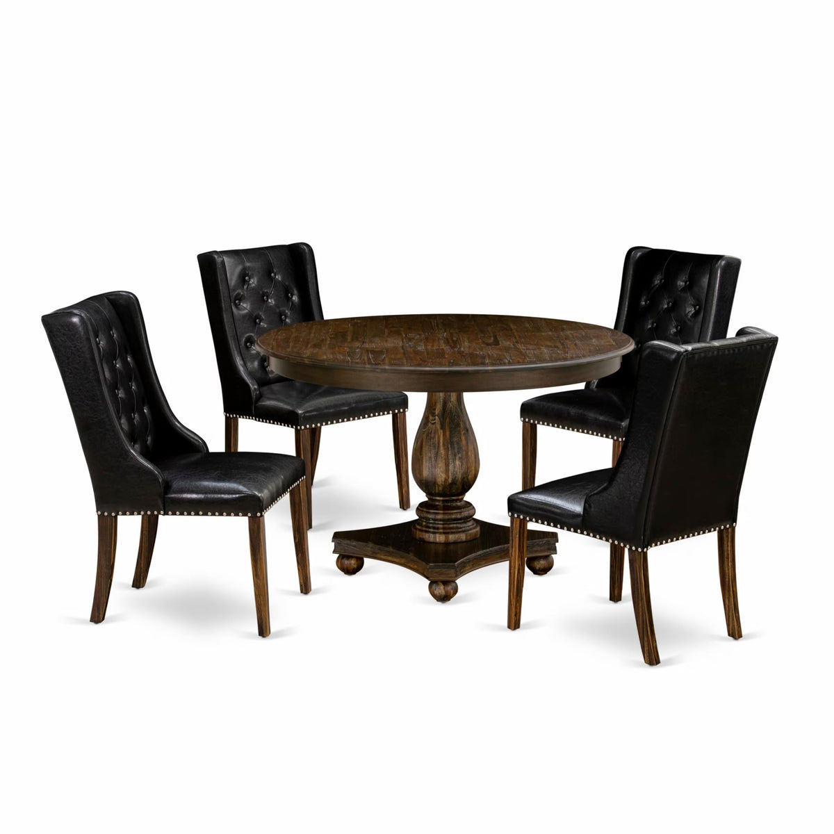 EAST WEST FURNITURE - F2FO5-749 - 5 PIECE MODERN DINING SETEnhance the aesthetic appeal of your kitchen or dining area with this 5-piece dining room table set. It includes 4 dining chairs and a mid-century dining table. The kitchen table features a charming Distressed Jacobean finish, while the mid-century modern dining chairs add elegance to any home with their Black PU Leather upholstery. This versatile set is perfect for kitchen, kitchen, and dining areas, comfortably seating up to four people and allowing families to enjoy meals together. The modern dining table showcases a Distressed Jacobean Round table top and Distressed Jacobean Pedestal Legs, while the nail head upholstered dining chairs feature Black PU Leather and Distressed Jacobean Wooden 4 Legs. We have crafted this innovative dining set using high-quality and durable materials. Assembly is quick and easy, as each set is conveniently flat packed with comprehensive instructions and all necessary tools. This contemporary, budget-friendly, durable, and comfortable kitchen dining table set is an excellent choice for those who appreciate a pleasant dining experience. The mid-century dining set is easy to clean and always exudes an appealing charm.MODERN DINING SET FEATURES: Wood Material: Rubberwood Fabric Material: PU Leather Wood Table Color: Distressed Jacobean Modern Chair Fabric Color: Black Dining Chair Legs Color: Distressed Jacobean Dining Chair Back: Button Tufted Dining Table Dimensions: Length: 48; Width: 48; Height: 30. Chair Dimensions: Length: 23.5; Width: 20.5; Height: 38.Package Include: 1 Mid Century Dining Table and 4 Modern Dining Chairs.