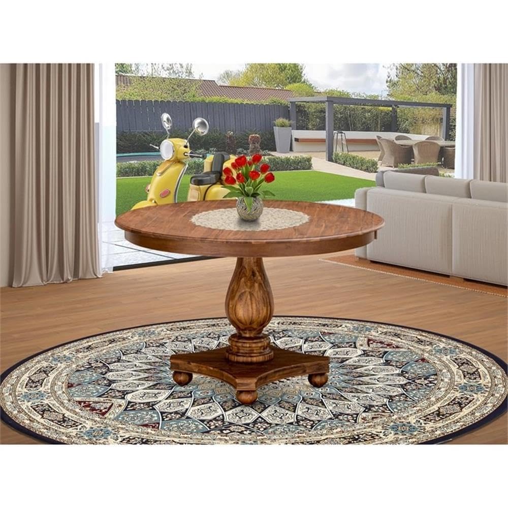 EAST WEST FURNITURE - FE2-0N-TP - DINING ROOM TABLEWhen searching for a kitchen table to buy for your kitchen or dining area, it's important to select one that suits your space, budget, and preferred style. If you have a small apartment or need to maximize space in your kitchen, the Ferris breakfast table offers an ideal solution. This timeless dining table features a round tabletop (48 inches in diameter) without any corners, allowing it to save space. The table's pedestal base enables you to effortlessly slide chairs underneath, reducing the table's footprint in the room. Crafted from durable rubberwood, also known as Asian hardwood, this rustic dining table boasts a Sandblasting Antique Walnut finish that complements any existing room decor and adds a natural aesthetic to your dining area or kitchen. Rubberwood possesses some appealing qualities, such as eco-friendliness, shock absorbance, and fire resistance. Additionally, the dining table includes a clear and user-friendly installation manual, making it easy for anyone to assemble with minimal preparation and time.FEATURES: Material: Rubberwood Base Type: Pedestal Color: Sandblasting Antique Walnut Seating Capacity: Up to 6 Dimensions: Length: 48; Width: 48; Height: 30.